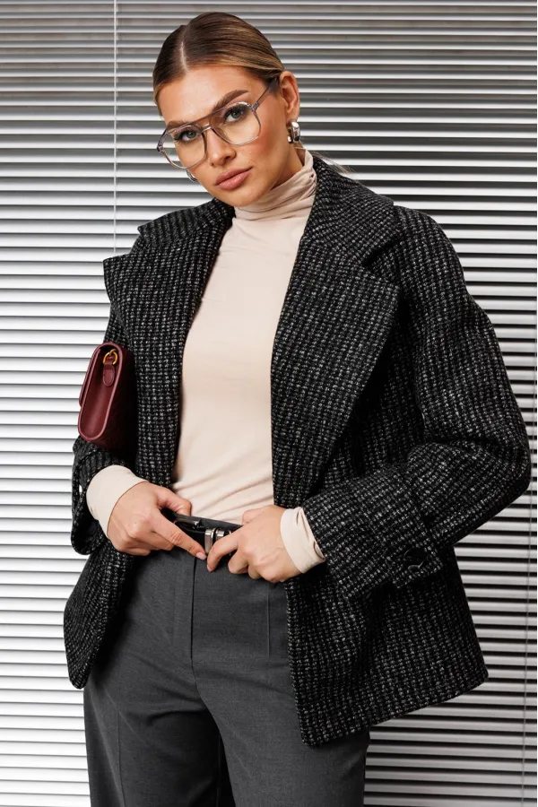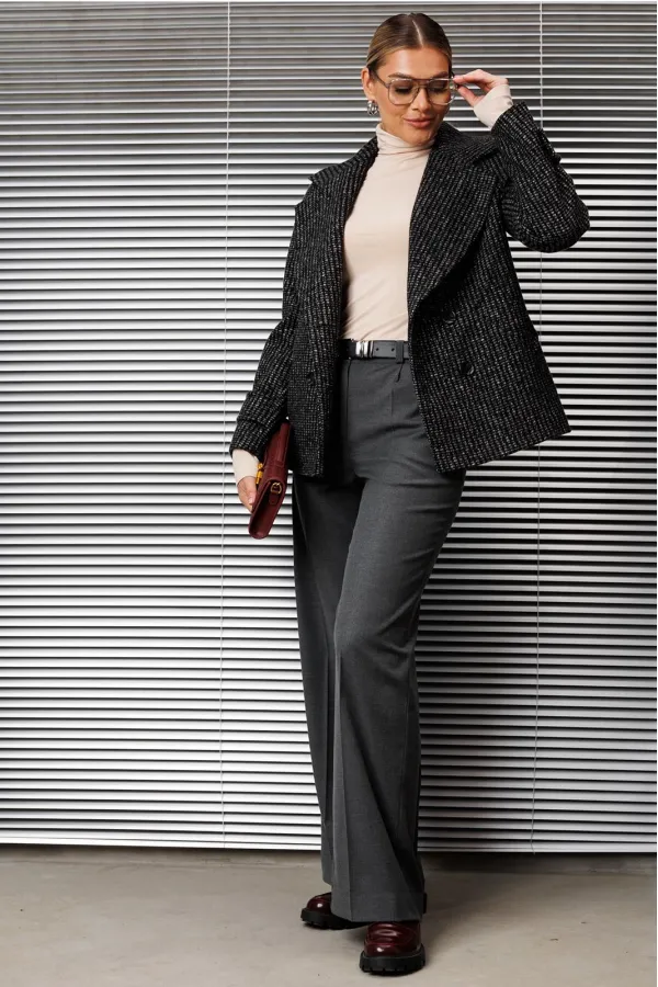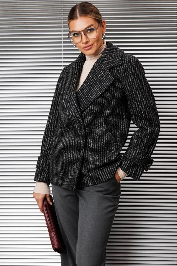 Благородные оттенки серого созданы для осени. Теплое полупальто, надетое на уютный свитер - самая нужная вещь в гардеробе современной модницы. Полупальто прямого силуэта, на полочках обработаны карманы с листочкой. Рукав реглан, двухшовный, с локтевой вытачкой. Воротник пиджачного типа. Жакет на подкладке. Брюки прямые, спереди со складками и карманами на притачном поясе, с настрочными шлевками. Застежка спереди на тесьму-молнию.