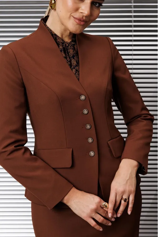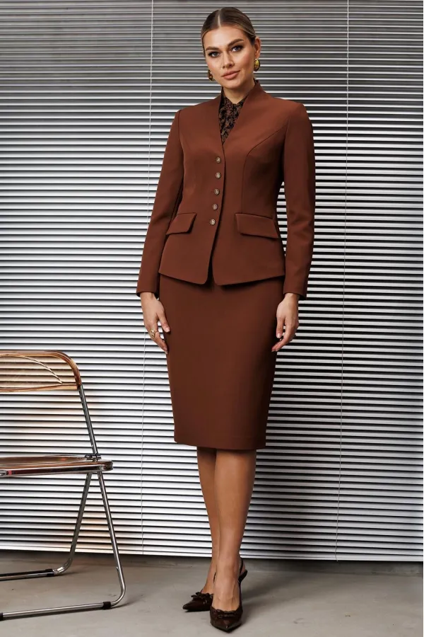 Застежка на тесьму-молнию в среднем шве, который переходит в шлицу. Жакет и юбка на подкладке.