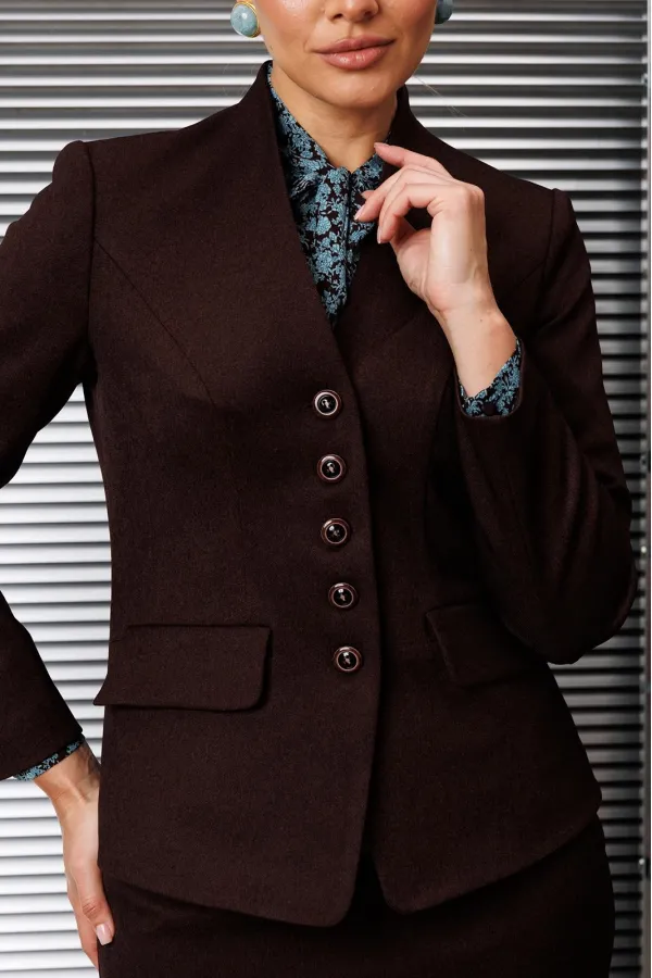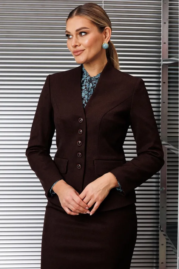 Застежка на тесьму-молнию в среднем шве, который переходит в шлицу. Жакет и юбка на подкладке.