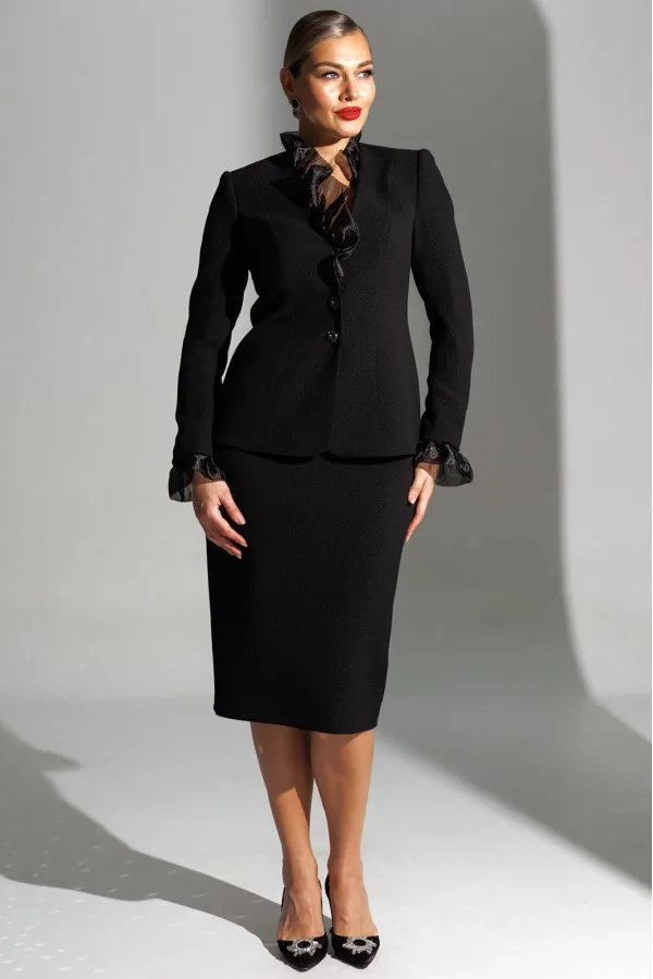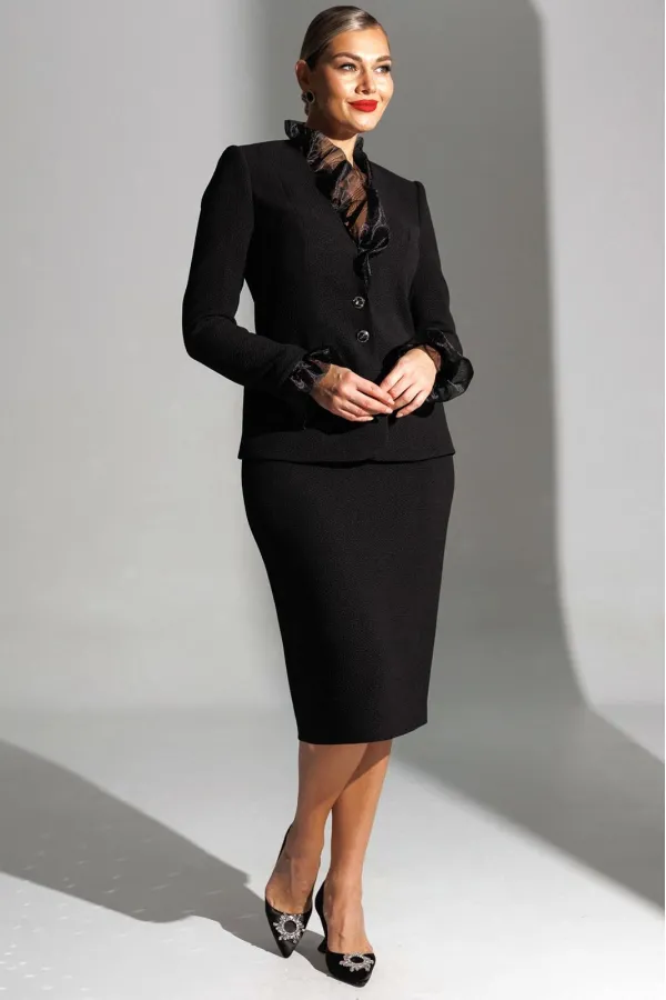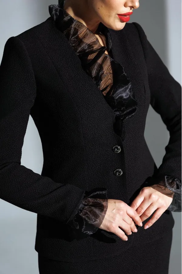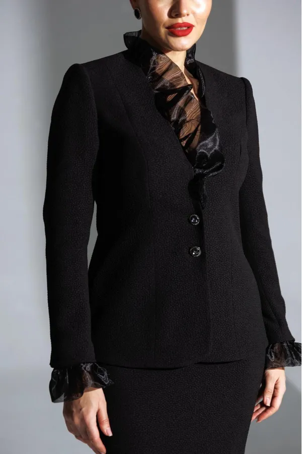 Один из самых элегантных образов в арсенале бренда. Жакет и юбка выполнены из фактурного полотна. Декором и главным акцентом данного комплекта является съемная рюша по линии горловины и низу рукава, выполненная из органзы. Жакет полуприлегающего силуэта с рельефами по переду и спинке. Рукав втачной, двухшовный. Спинка со средним швом. Застежка центральная на петли-пуговицы. Юбка прямая, зауженная к низу, на притачном поясе, по бокам с резинками. Застежка на тесьму-молнию в среднем шве, который переходит в шлицу. Костюм на подкладке.