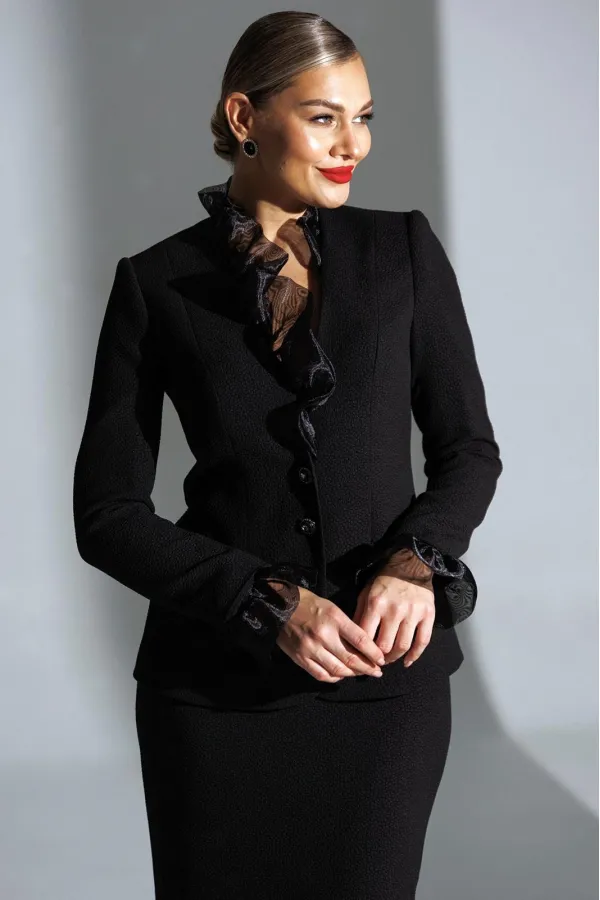 Один из самых элегантных образов в арсенале бренда. Жакет и юбка выполнены из фактурного полотна. Декором и главным акцентом данного комплекта является съемная рюша по линии горловины и низу рукава, выполненная из органз... Читать далее...