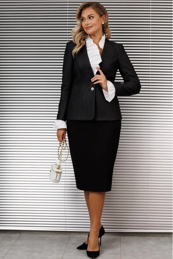 Один из самых элегантных образов в арсенале нашего бренда. Жакет выполнен из фактурного полотна в сочетании с однотоном. Декором и главным акцентом данного комплекта является съемная рюша по линии горловины и низу рукава. Жакет полуприлегающего силуэта с рельефами по переду и спинке. Рукав втачной, двухшовный. Спинка со средним швом. Застежка центральная на петли-пуговицы. Юбка прямая, зауженная к низу, на притачном поясе, по бокам с резинками. Застежка на тесьму-молнию в среднем шве, который переходит в шлицу. Костюм на подкладке.