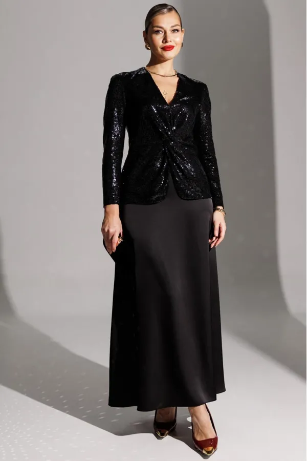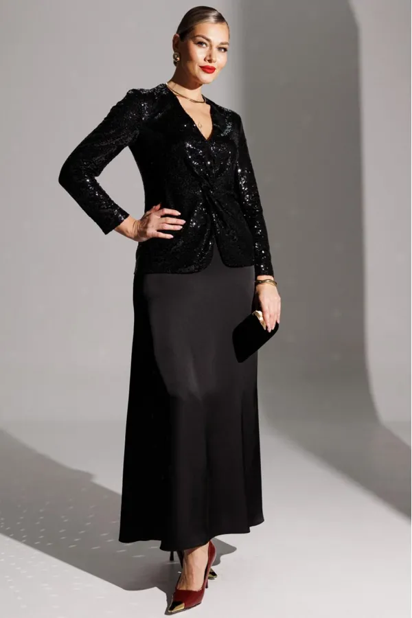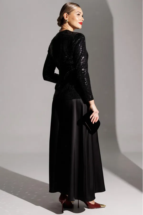Продолжением нашей нарядной коллекции является роскошный комплект, состоящий из блузы, имитирующей жакет, и невероятной струящейся юбки из атласа длины макси. Блуза из ткани в пайетки с декоративным узлом в области талии... Читать далее...