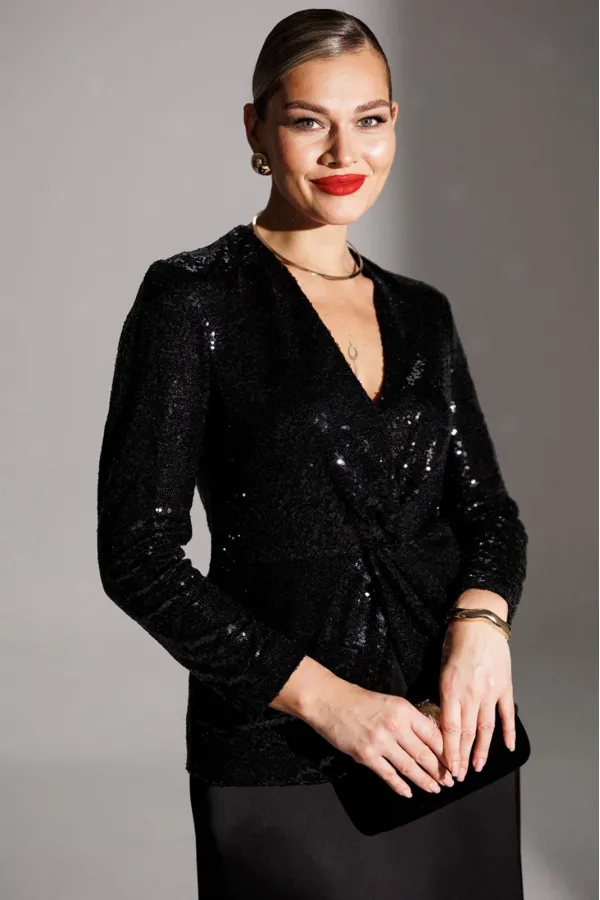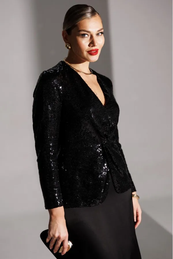 Продолжением нашей нарядной коллекции является роскошный комплект, состоящий из блузы, имитирующей жакет, и невероятной струящейся юбки из атласа длины макси. Блуза из ткани в пайетки с декоративным узлом в области талии. V-образный вырез. Блуза приталенного силуэта с втачными, двухшовными рукавами. Блуза частично на подкладке. Юбка на поясе с резинкой.