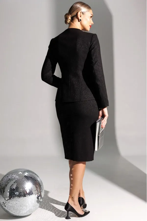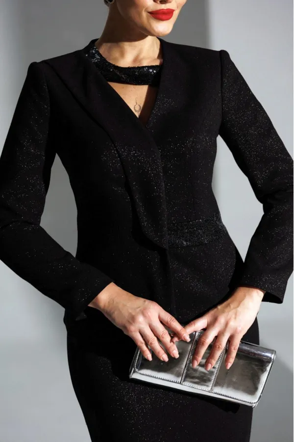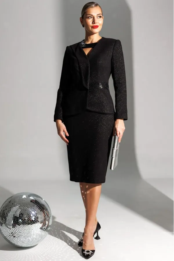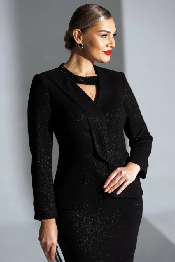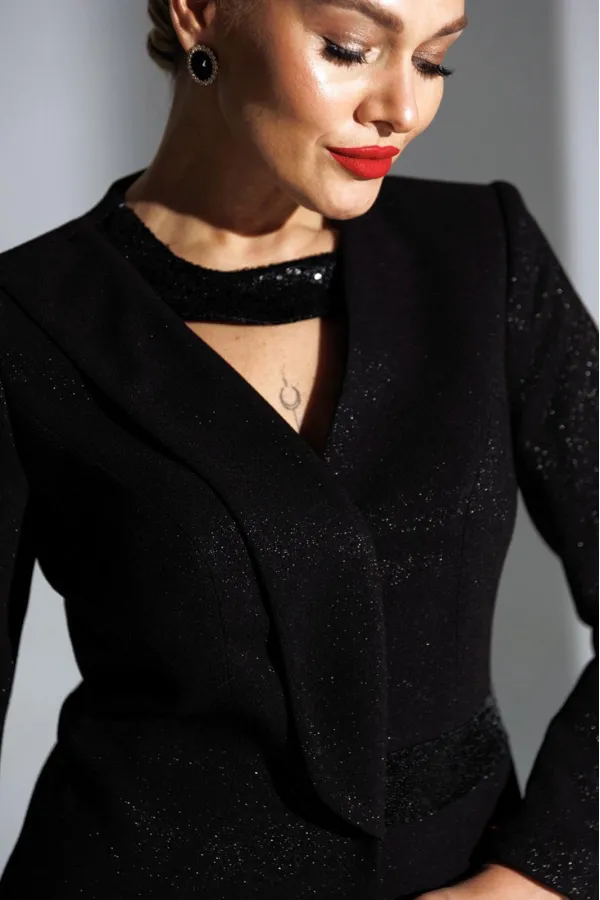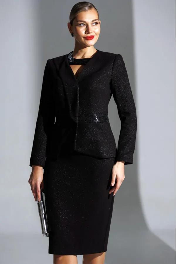 Женственность в каждом шве! Мы предлагаем Вам модель, которая выделит Ваши лучшие стороны: акцент на талию, плавные линии, идеальная посадка. Забудьте о массивных плечах и прямых линиях - теперь это нежные линии, которые подчеркивают Вашу фигуру и добавляют образу утонченности. Жакет полуприлегающего силуэта с рельефами по переду и спинке. Рукава втачные, двухшовные. Спинка со средним швом. Жакет декорирован отрезными деталями по линии талии и горловине, которые выполнены из ткани в пайетки. Главным акцентом является отрезной лацкан с одной стороны и брошь, декорированная жемчужинами, с другой стороны. Застежка на металлические пришивные кнопки. Юбка прямая, зауженная к низу, сверху на притачном поясе, по бокам с резинками. Застежка на тесьму-молнию в среднем шве. Комплект на подкладке.