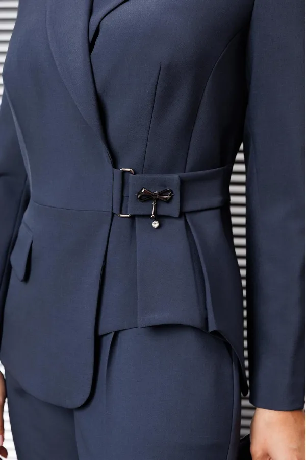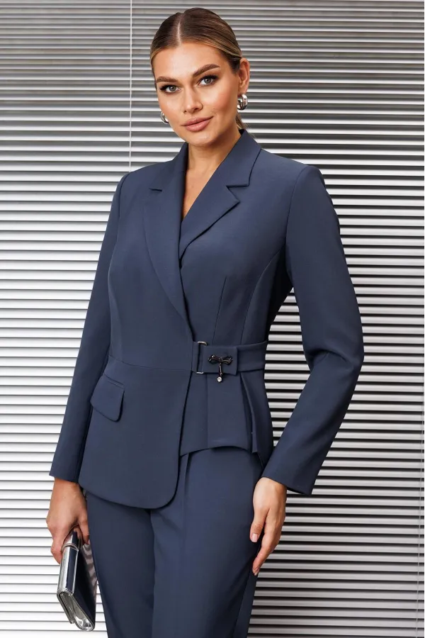 Двухпредметный комплект, который состоит из жакета и брюк. Жакет полуприлегающего силуэта с ассиметричной полочкой, на которой выполнен карман в рамку. Рукав втачной, двухшовный. Спинка со средним швом и талиевыми вытачками. Воротник пиджачной формы. Жакет на подкладке. Брюки прямые, по низу с манжетой, сверху на притачном поясе-кокетке, по бокам с карманами. Застежка на тесьму-молнию в среднем шве.