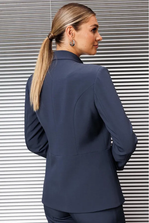 Двухпредметный комплект, который состоит из жакета и брюк. Жакет полуприлегающего силуэта с ассиметричной полочкой, на которой выполнен карман в рамку. Рукав втачной, двухшовный. Спинка со средним швом и талиевыми вытачк... Читать далее...