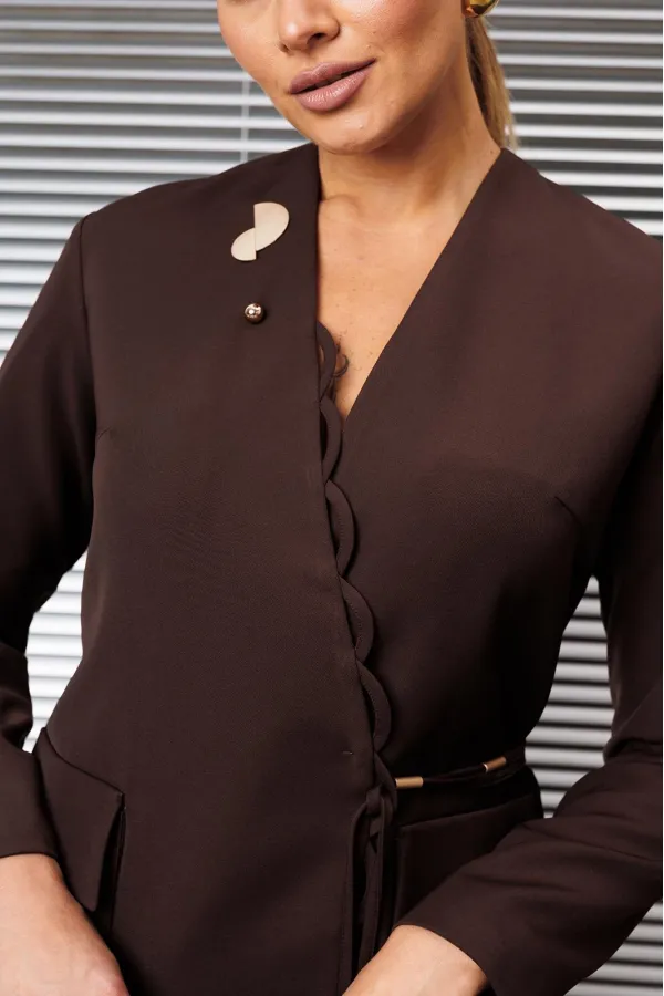 Линия плеча спущена, что добавляет расслабленности, а рукав рубашечного покроя обеспечивает комфорт. Особым элементом дизайна является шнур вокруг талии с металлической фурнитурой, который можно регулировать для создания идеальной посадки. Жакет также дополнен съемной брошью, что позволяет варьировать стиль. Внутренняя подкладка обеспечивает дополнительный комфорт.
