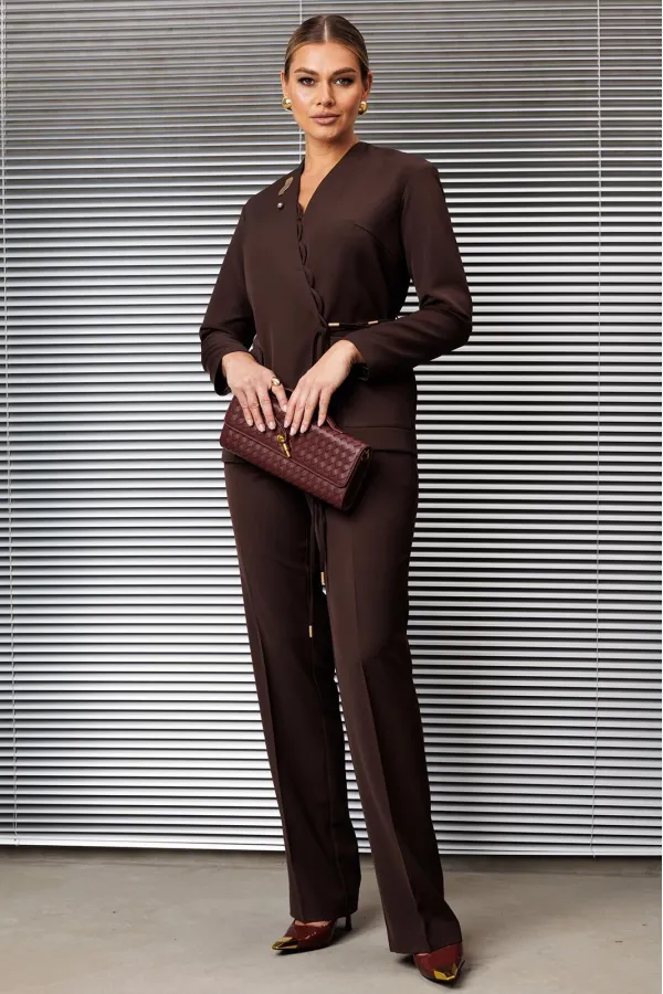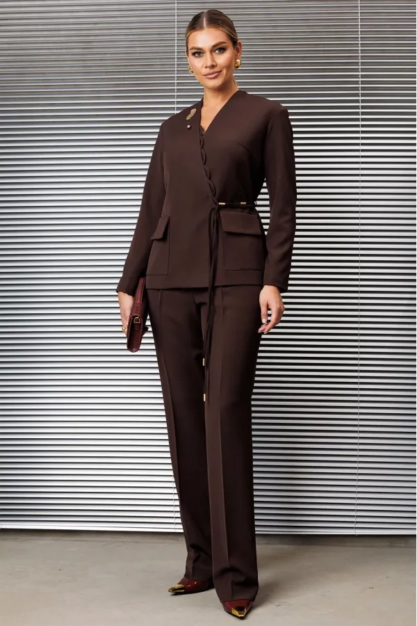 Брючный костюм, состоящий из жакета и брюк, представляет собой стильный и современный ансамбль, идеально подходящий для различных случаев. Жакет свободного кроя оснащен двубортной застежкой на потайную кнопку, что придает ему элегантный вид. Спинка выполнена со средним швом, а передняя часть украшена нагрудными вытачками и крупными накладными карманами с клапанами, добавляющими практичности. V-образный вырез горловины создает визуальный акцент, а край борта, декорированный воздушными петлями, придает жакету легкость и изящество.