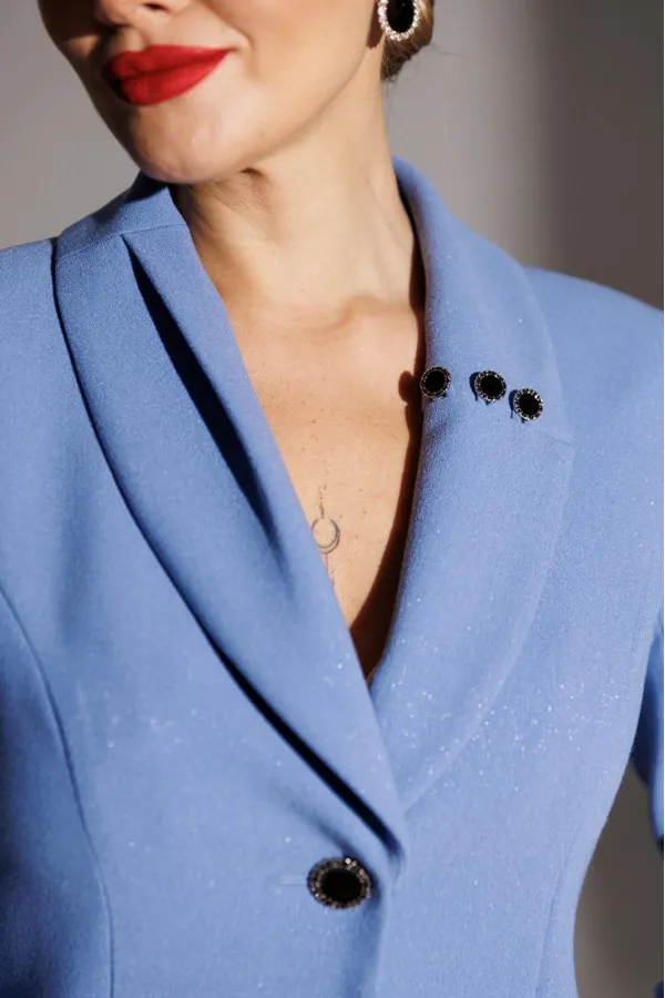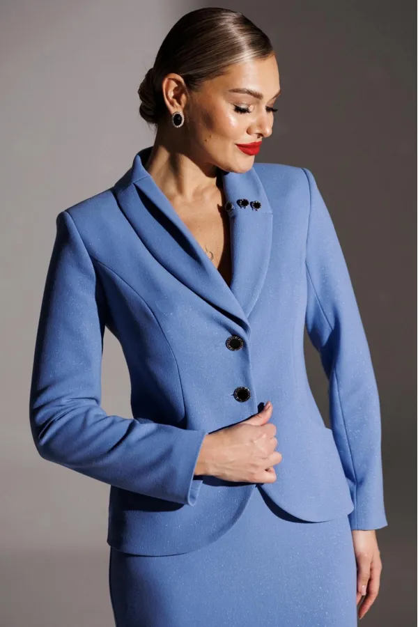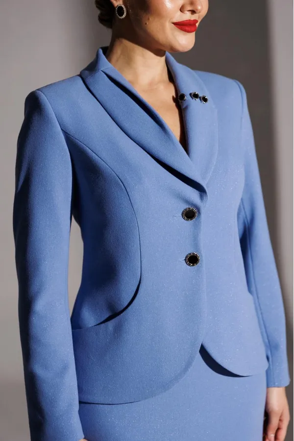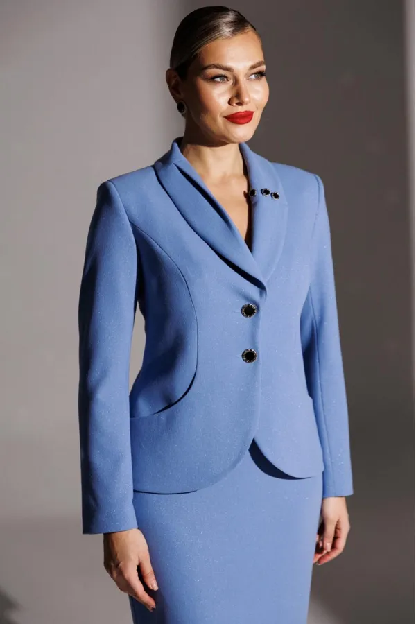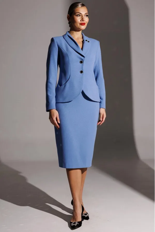 Элегантность с характером. Именно так можно описать одну из образов от брэнда. Она идеально впишется в модный гардероб и подчеркнет вашу естественную красоту. Жакет полуприлегающего силуэта с фигурными рельефами, переходящими в карман. В жакете фантазийный воротник с декоративными элементами. Застежка центральная на петли-пуговицы. Рукав втачной, двухшовный. Спинка со средним швом и вытачками. Юбка прямая, зауженная к низу, сверху на притачном поясе. Застежка на тесьму-молнию в среднем шве, который переходит в шлицу. Костюм на подкладке.