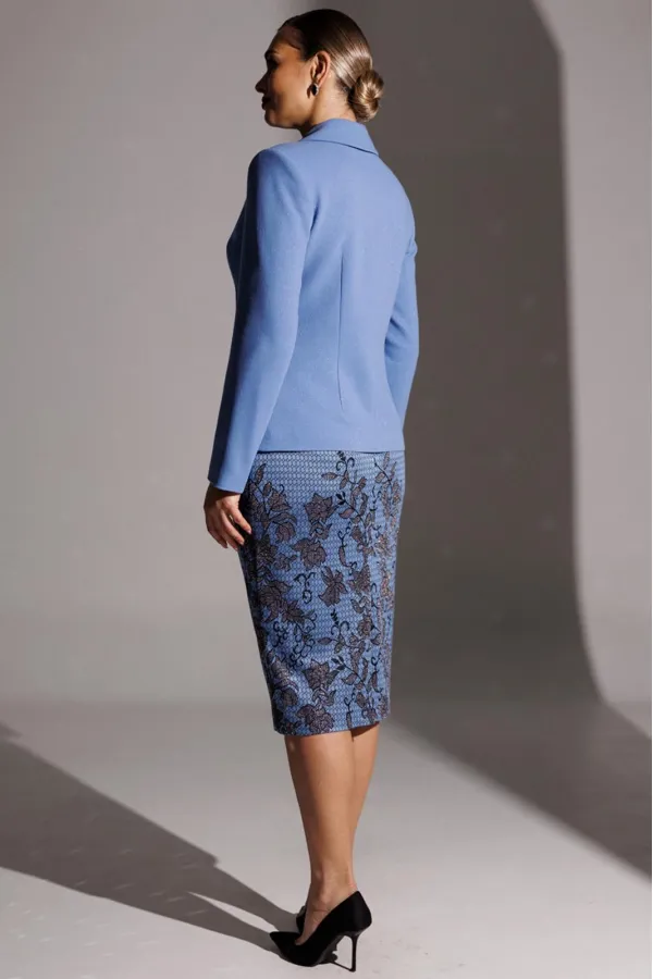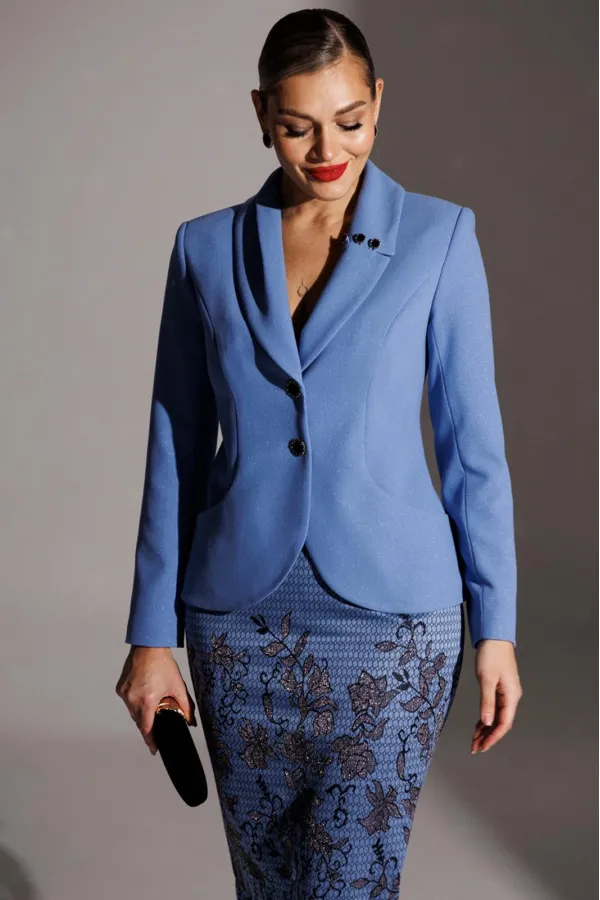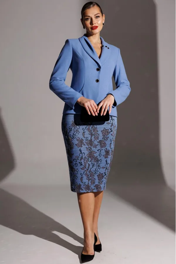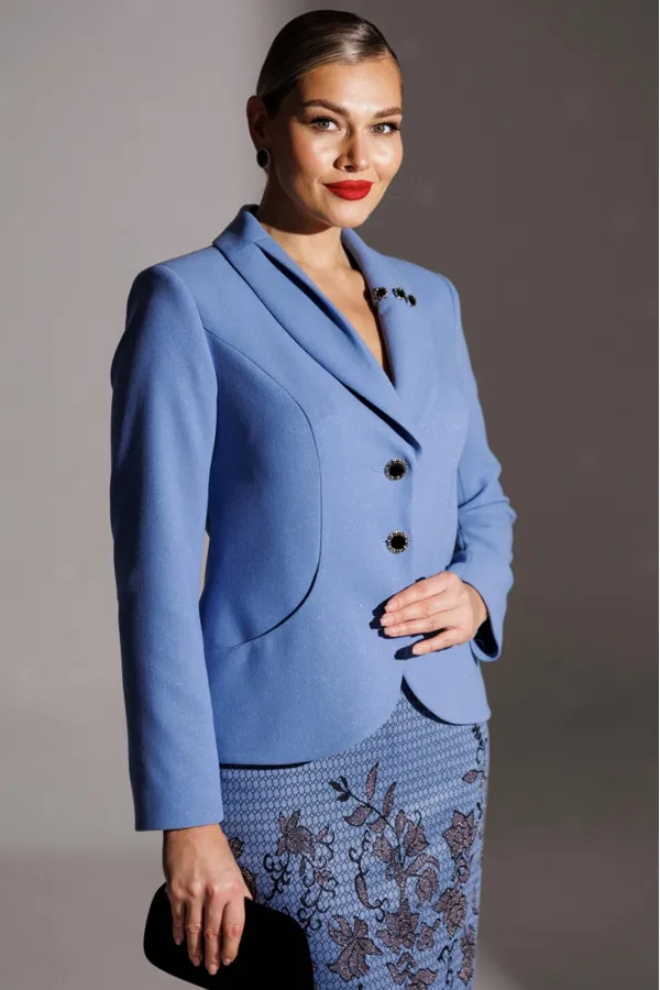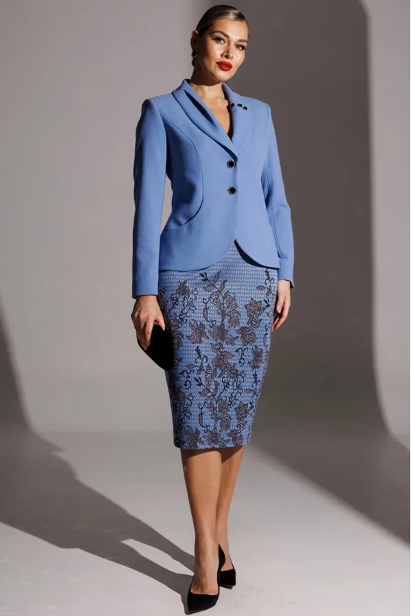 Элегантность с характером. Именно так можно описать одну из образов от брэнда. Она идеально впишется в модный гардероб и подчеркнет вашу естественную красоту. Жакет полуприлегающего силуэта с фигурными рельефами, переходящими в карман. В жакете фантазийный воротник с декоративными элементами. Застежка центральная на петли-пуговицы. Рукав втачной, двухшовный. Спинка со средним швом и вытачками. Юбка прямая, зауженная к низу, сверху на притачном поясе. Застежка на тесьму-молнию в среднем шве, который переходит в шлицу. Костюм на подкладке.
