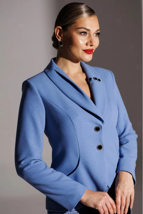 | Ткань | Жакет: полиэстер 62% вискоза 33% спандекс 3% люрекс 2%. Юбка: полиэстер 68% вискоза 18% эластан 7% люрекс 7%. |