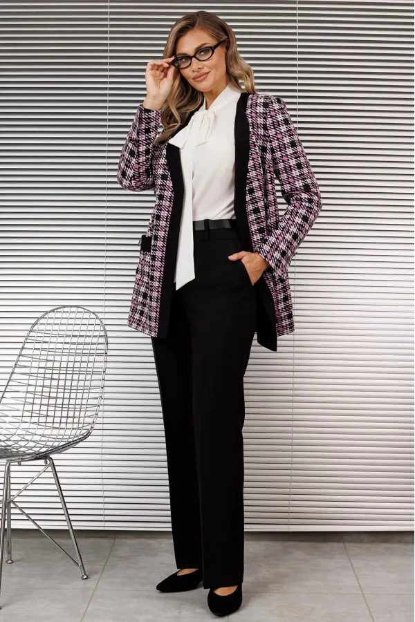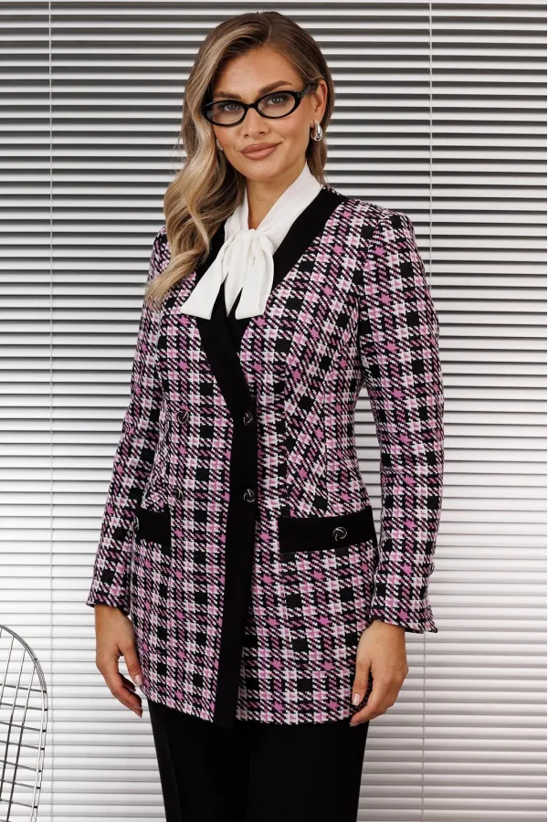 Если Вы только в начале пути к гардеробу Вашей мечты, то удлиненный жакет - отличный старт и отправная точка. Он станет Вам лучшим другом и превратит в настоящую леди. Мы предлагаем его в тандеме с прямыми, однотонными брюками. Брюки на притачном поясе-кокетке, со стрелками, на передних половинах брюк обработаны карманы. Жакет двубортный, с нагрудными вытачками и рельефами, выполнен из трикотажного полотна отличного качества. Полочка по борту с отрезной планкой. Спинка со средним швом и талиевыми вытачками. Рукав двухшовный с отлетной шлицей. Застежка на петли-пуговицы. Жакет на подкладке.