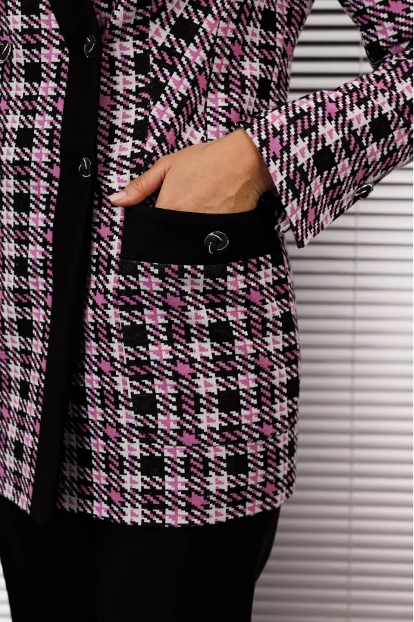| Ткань | Жакет: полиэстер 65% вискоза 33% спандекс 2% (трикотажное полотно). Брюки: полиэстер 74% вискоза 22% спандекс 4%. |