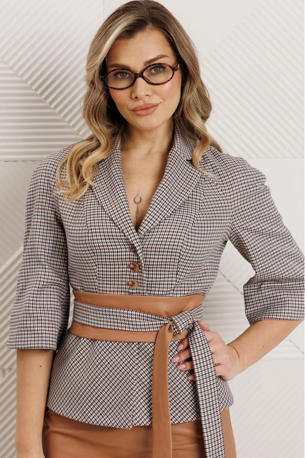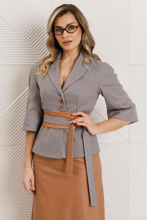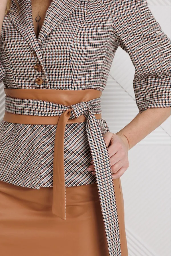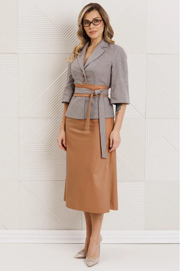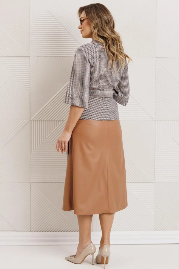 Бестселлер нашей коллекции - двухпредметный костюм, состоящий из жакета и юбки. Акцентом данного комплекта является съемный пояс. Жакет прилегающего силуэта с отрезной баской по переду и спинка с рельефами. Рукав-реглан. Жакет выполнен из приятного, мягкого текстиля в гусиную лапку. Юбка А-силуэта на притачном поясе, сзади с резинкой. Застежка на тесьму-молнию в боковом шве. Юбка выполнена из экокожи. Костюм на подкладке.