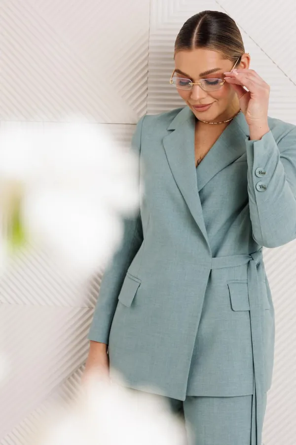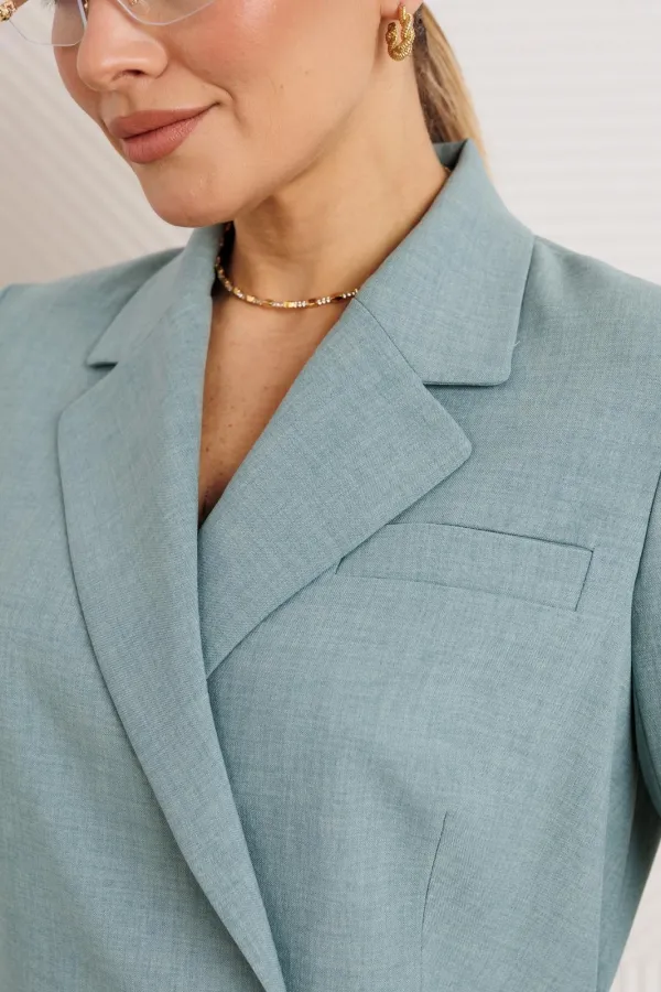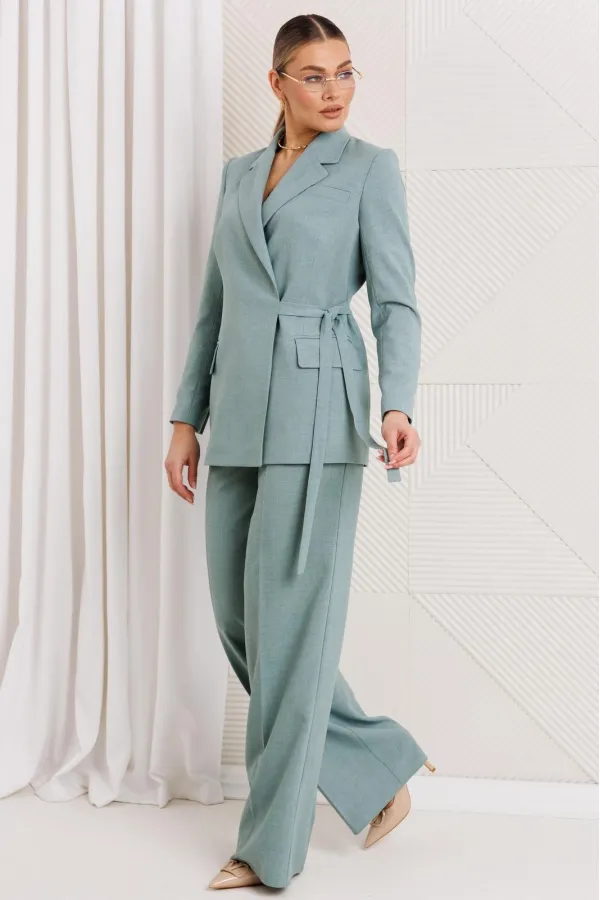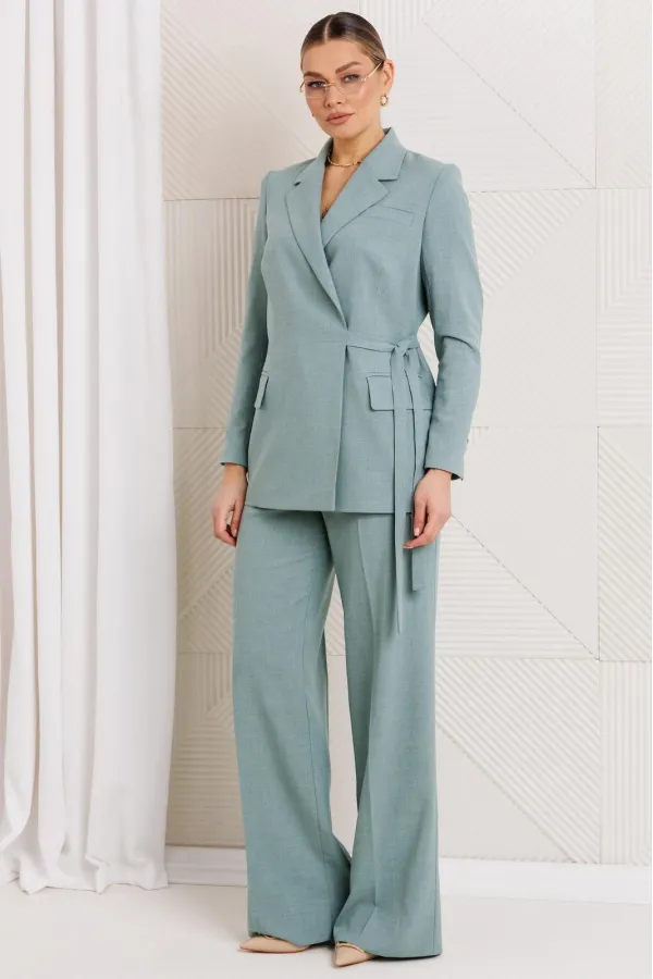 Женский трендовый костюм, состоящий из жакета и брюк. Жакет полуприлегающего силуэта, удлиненный, со смещенной бортовой застежкой на завязку и потайную пуговицу. По переду талиевые вытачки, выходящие от горизонтальных подрезов, в которых обработаны карманы в рамку с клапанами. На груди обработана листочка, имитирующая нагрудной карман. Спинка со средним швом и талиевыми вытачками. Рукав втачной, двухшовный, со шлицей. На шлицах по две декоративных пуговиц. Воротник пиджачного типа. Жакет на подкладке. Брюки на притачном поясе с резинкой, прямые, со складкой по талии и с заутюженными кантами. По бокам обработаны карманы. Брюки с завышенной талией, свободной формы, выгодно подчеркивают изящность ног и придают fashion-нотку образу. Удобная в носке ткань, хорошая посадка по фигуре, универсальность и лаконичность модели не оставят равнодушной ни одну женщину.