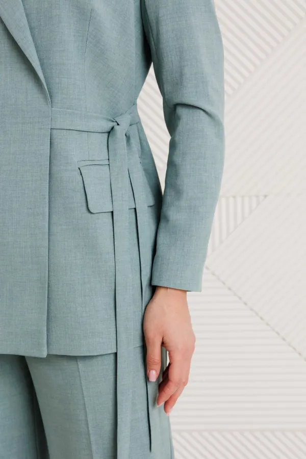 Женский трендовый костюм, состоящий из жакета и брюк. Жакет полуприлегающего силуэта, удлиненный, со смещенной бортовой застежкой на завязку и потайную пуговицу. По переду талиевые вытачки, выходящие от горизонтальных по... Читать далее...