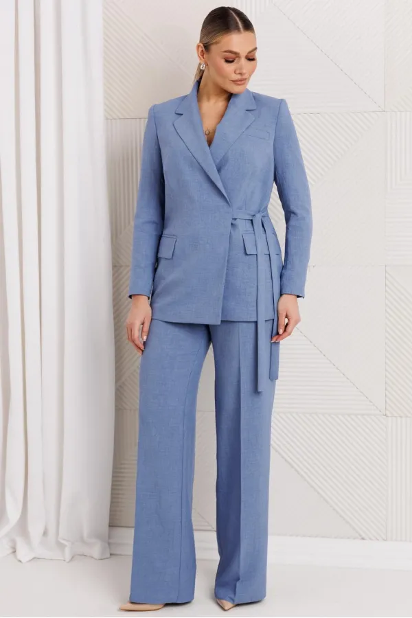 Женский трендовый костюм, состоящий из жакета и брюк. Жакет полуприлегающего силуэта, удлиненный, со смещенной бортовой застежкой на завязку и потайную пуговицу. По переду талиевые вытачки, выходящие от горизонтальных подрезов, в которых обработаны карманы в рамку с клапанами. На груди обработана листочка, имитирующая нагрудной карман. Спинка со средним швом и талиевыми вытачками. Рукав втачной, двухшовный, со шлицей. На шлицах по две декоративных пуговиц. Воротник пиджачного типа. Жакет на подкладке. Брюки на притачном поясе с резинкой, прямые, со складкой по талии и с заутюженными кантами. По бокам обработаны карманы. Брюки с завышенной талией, свободной формы, выгодно подчеркивают изящность ног и придают fashion-нотку образу. Удобная в носке ткань, хорошая посадка по фигуре, универсальность и лаконичность модели не оставят равнодушной ни одну женщину.