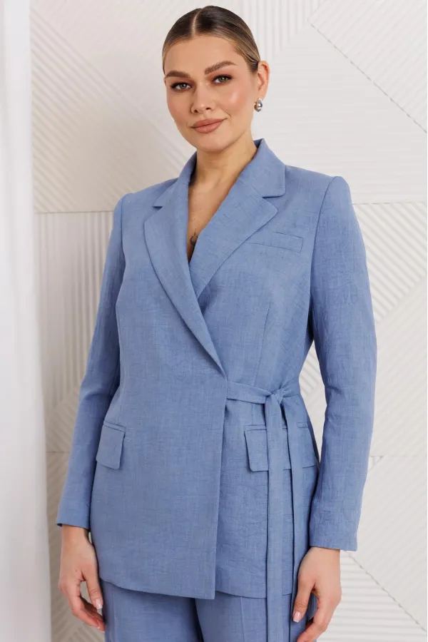 Женский трендовый костюм, состоящий из жакета и брюк. Жакет полуприлегающего силуэта, удлиненный, со смещенной бортовой застежкой на завязку и потайную пуговицу. По переду талиевые вытачки, выходящие от горизонтальных по... Читать далее...
