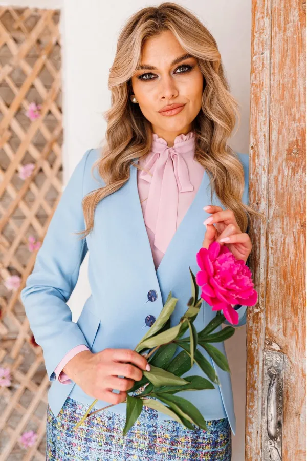Стильный, трехпредметный костюм от бренда М О Д А-Ю Р С, состоящий из жакета, блузы и юбки. Жакет полуприлегающего силуэта, отрезной по линии талии, спереди со шлицами. Спинка с талиевыми вытачками и средним швом. Рукав втачной, двухшовный. Застежка центральная на петли-пуговицы. Юбка прямая, зауженная к низу, сверху на притачном поясе. Застежка на тесьму-молнию в среднем шве, который переходит в шлицу. Юбка на подкладке. Блуза прямого силуэта, в боковых швах с разрезами. По переду с нагрудными вытачками, выходящими из бокового шва. Рукав втачной, одношовный, снизу на притачной манжете. Застежка на петли-пуговицы. Главным акцентом блузы является воротник-стойка, переходящий в бант.