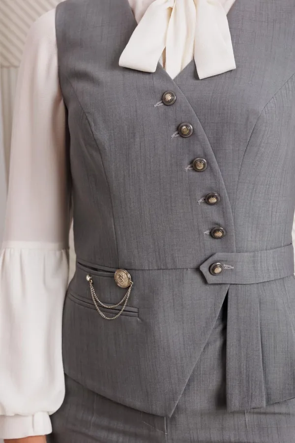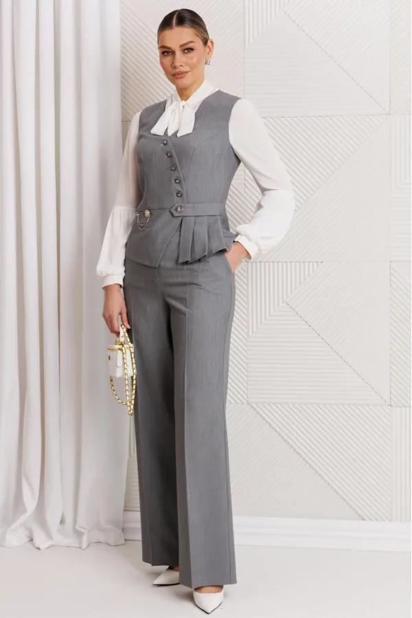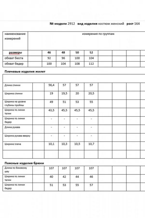 Комплект женский, состоящий из брюк и жилета. Жилет полуприлегающего силуэта с рельефами по переду и спинке, отрезной по линии талии. Низ жилета ассиметричной формы. На баске с одной стороны обработаны прорезные карманы в рамку, один из которых функциональный. Застежка двубортная на петли-пуговицы и декоративную пату. Жилет на подкладке. Брюки прямые, сверху на притачном поясе, сзади с резинкой. На передних половинках обработаны карманы. Застежка на тесьму-молнию. Данный комплект можно дополнить блузой, что позволит Вам создать разные образы.