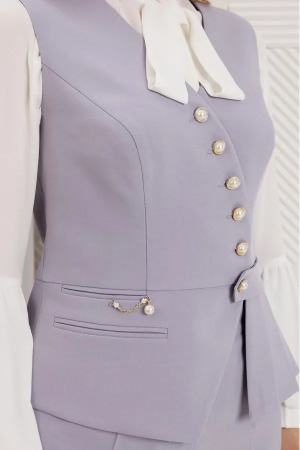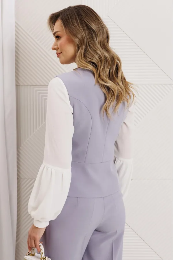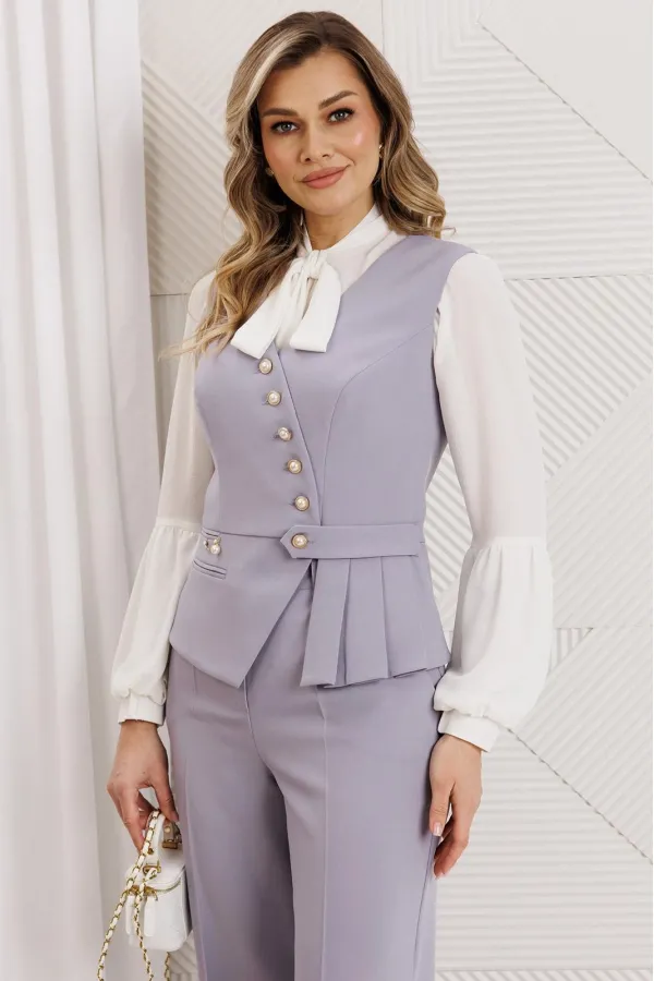Комплект женский, состоящий из брюк и жилета. Жилет полуприлегающего силуэта с рельефами по переду и спинке, отрезной по линии талии. Низ жилета ассиметричной формы. На баске с одной стороны обработаны прорезные карманы в рамку, один из которых функциональный. Застежка двубортная на петли-пуговицы и декоративную пату. Жилет на подкладке. Брюки прямые, сверху на притачном поясе, сзади с резинкой. На передних половинках обработаны карманы. Застежка на тесьму-молнию. Данный комплект можно дополнить блузой, что позволит Вам создать разные образы.