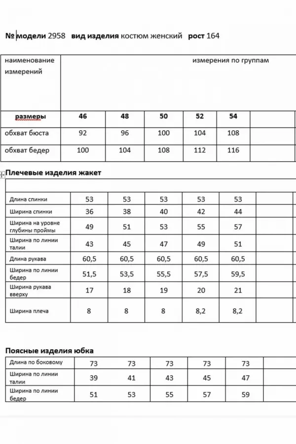 Юбка прямая, зауженная к низу, сверху на притачном поясе. Застежка на тесьму-молнию в среднем шве, который переходит в шлицу. Костюм на подкладке.
