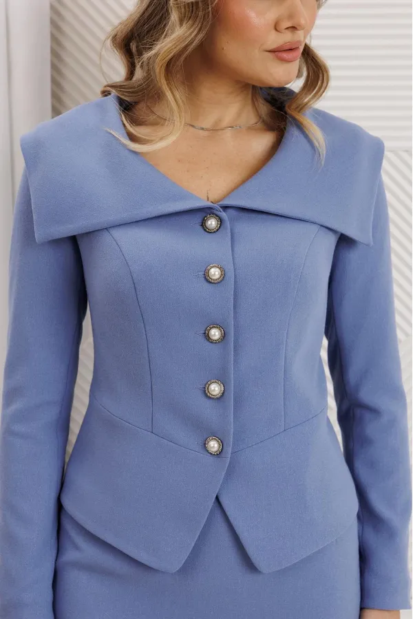 Объёмный воротник апаш не только украшает жакет, но и придаёт ему оригинальности. Спинка с средним швом и вертикальными рельефами гармонично завершает образ, а втачные двухшовные рукава добавляют удобства и стиля.
