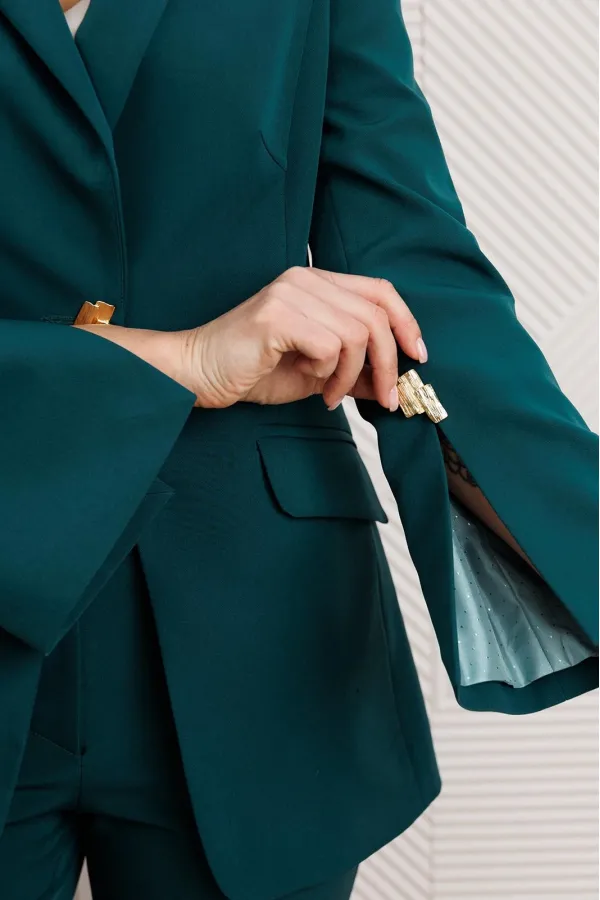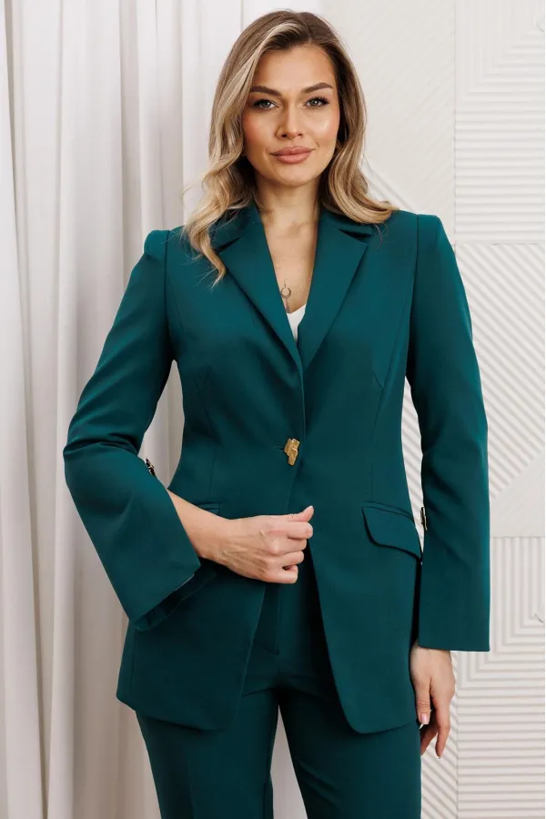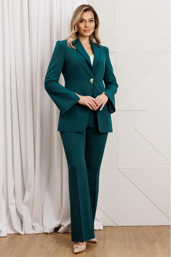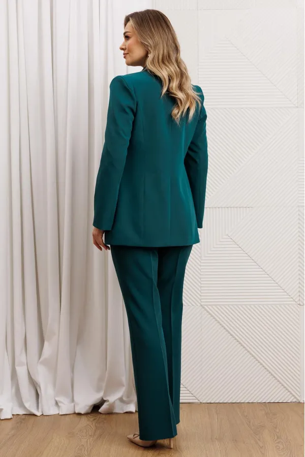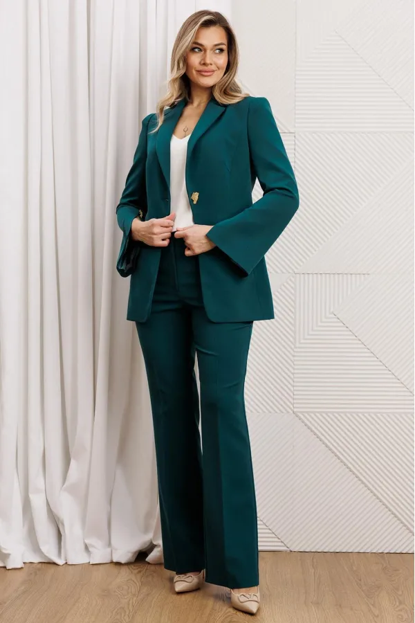 Деловой комплект, состоящий из жакета и брюк. Жакет - воплощение стильной трансформации. Его классический крой выполнен из безупречной костюмной ткани, но в деталях скрывается своенравный характер. Жакет полуприлегающего силуэта. Модель отличается аккуратным кроем и стильными деталями. На передней части жакета обработаны вертикальные рельефы, идущие от проймы до уровня кармана и от кармана до низа, что придаёт силуэту выразительность и стройность. Воротник пиджачного типа добавляет классической элегантности. Застёжка центральная бортовая на петлю-пуговицу. Карманы в рамке с клапанами, гармонично расположены на передней части жакета. Спинка с центральным швом и вертикальными рельефами, идущими от проймы. Рукава двухшовные с отрезной деталью по окату и разрезами внизу добавляют свободы движению и делают модель более интересной. Жакет на подкладке. Брюки с высокой посадкой, по линии талии – притачной пояс, в боковых швах резинка. Застежка на молнию.