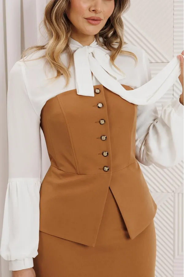 Этот нарядный костюм представляет собой элегантное и утонченное решение для особых случаев. Костюм состоит из корсета и юбки. Топ-корсет прилегающего силуэта с регилином по рельефам по переду и спинке, который обеспечивает дополнительную жёсткость и посадку на фигуре. Застёжка центральная бортовая на 6 петель и пуговиц. Низ переда фигурной заострённой формы, что подчёркивает элегантный силуэт. Модель идеально подходит для создания строгих, утонченных образов и может использоваться как в качестве элемента вечернего наряда, так и для повседневных образов с более нейтральными деталями. Наденьте его с нашей юбкой - это беспроигрышный дуэт, где игривость и строгость подчеркивают друг друга. Юбка прямая, зауженная к низу, сверху на притачном поясе. Застежка на тесьму-молнию в среднем шве, который переходит в шлицу. Костюм на подкладке.
