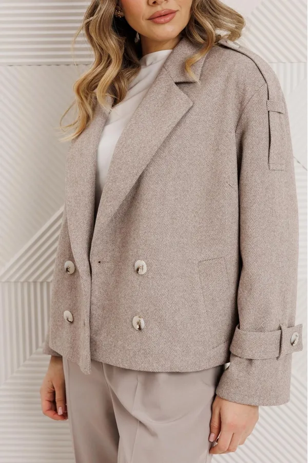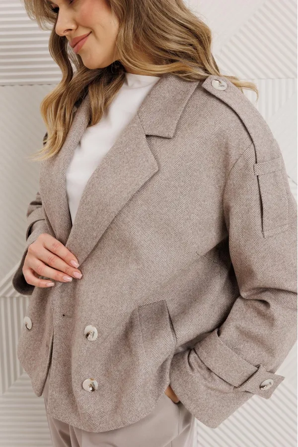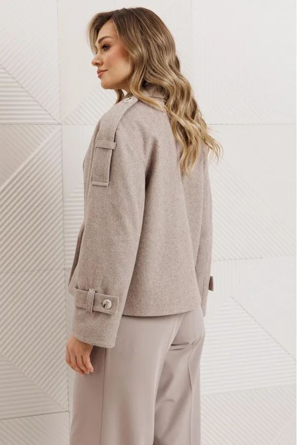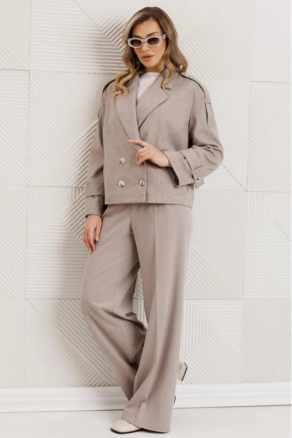 Универсальный комплект на межсезонье! Полупальто свободного силуэта с воротником пиджачного типа, с двубортной застёжкой на 2 пары пуговиц. По переду обработаны карманы и нагрудные вытачки. Спинка без среднего шва. Рукава одношовные с патами внизу,которые фиксируются шлёвками и пуговицами. На линии плеч:погоны-фиксируются шлёвками и пуговицами. Изделие на подкладке.