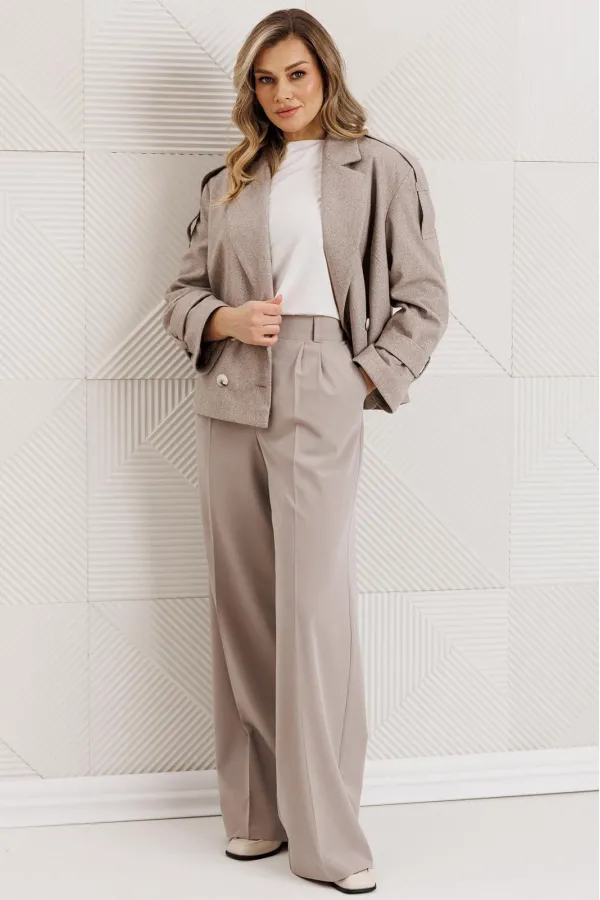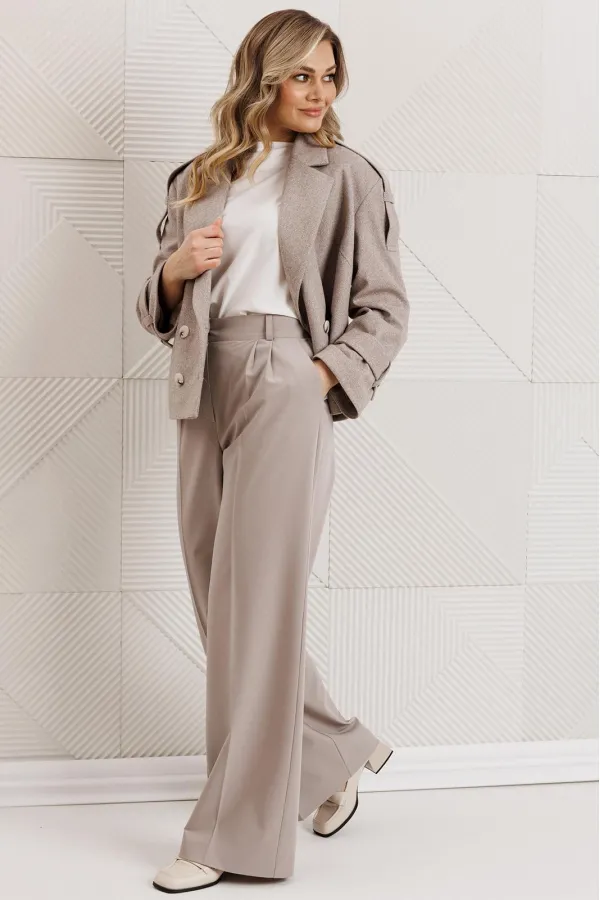 Брюки с высокой посадкой, широкие, со складками от пояса по переду и стрелками. Застёжка на молнию и пуговицу. Пояс притачной со шлёвками, сзади частично резинка. Спереди имеются карманы с отрезным бочком. На задних половинках - вытачки. Вместе они создают безупречный образ, где каждая деталь работает на Ваш безупречный вид и удобство.