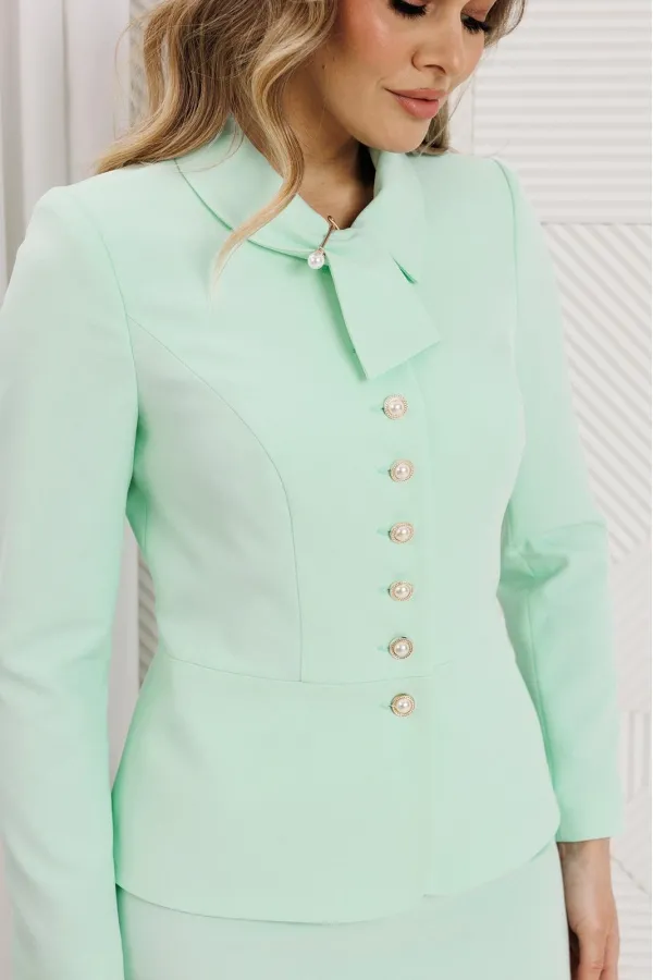 Юбка прямая, зауженная к низу, сверху на притачном поясе. Застежка на тесьму молнию в среднем шве, который переходит в шлицу. Костюм на подкладке.