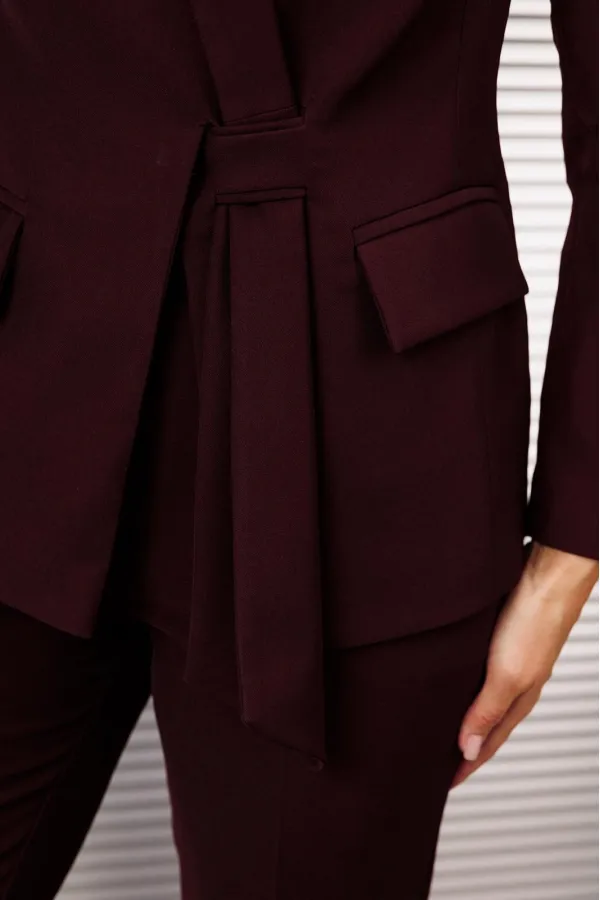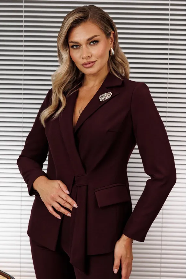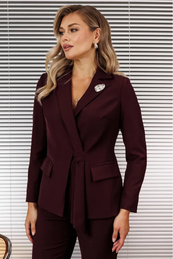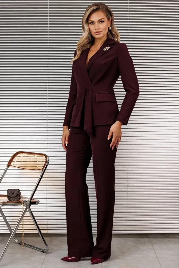 Костюм состоит из жакета и брюк, выполненных в элегантном стиле. Жакет полуприлегающего силуэта, отличается центральной застежкой на одну потайную кнопку. Спинка украшена средним швом и вертикальными рельефами, что придает фигуре стройность. Передняя часть жакета также имеет вертикальные рельефы, которые визуально удлиняют силуэт. Карманы «в рамку» с клапанами добавляют практичности и стиля. Особенностью жакета является воротник пиджачного типа, правый лацкан которого плавно переходит в «галстук», проходящий между двумя декоративными рамками на противоположной стороне переда. Эта деталь служит центром композиции и привлекает внимание. Жакет на подкладке дополнен декоративной брошью, которая добавляет изысканности. Брюки прямого кроя с заутюженными кантами и складкой от пояса спереди обеспечивают комфорт и элегантность. Боковые карманы делают их функциональными, а застежка в среднем шве на молнию и притачной пояс с резинкой сзади обеспечивают идеальную посадку. Костюм идеально подходит для деловых встреч и особых случаев, подчеркивая стиль и утонченность своего владельца.