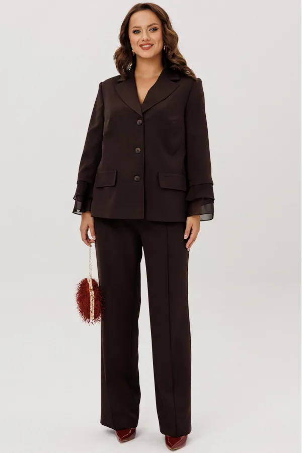Жакет прямого силуэта с нагрудными вытачками по переду. Накладные клапаны, являются имитацией кармана. По горловине воротник с отложными бортами пиджачного типа. Застежка на три петли-пуговицы. По спинке центральный разрез эффектно оформлен декоративной вставкой из струящегося шифона, который дополняет отделочная пуговица (не функциональная при застегивании). Рукав втачной, двухшовный, длина 7/8. По низу рукава два притачных волана из шифоновой ткани. Жакет на подкладке.