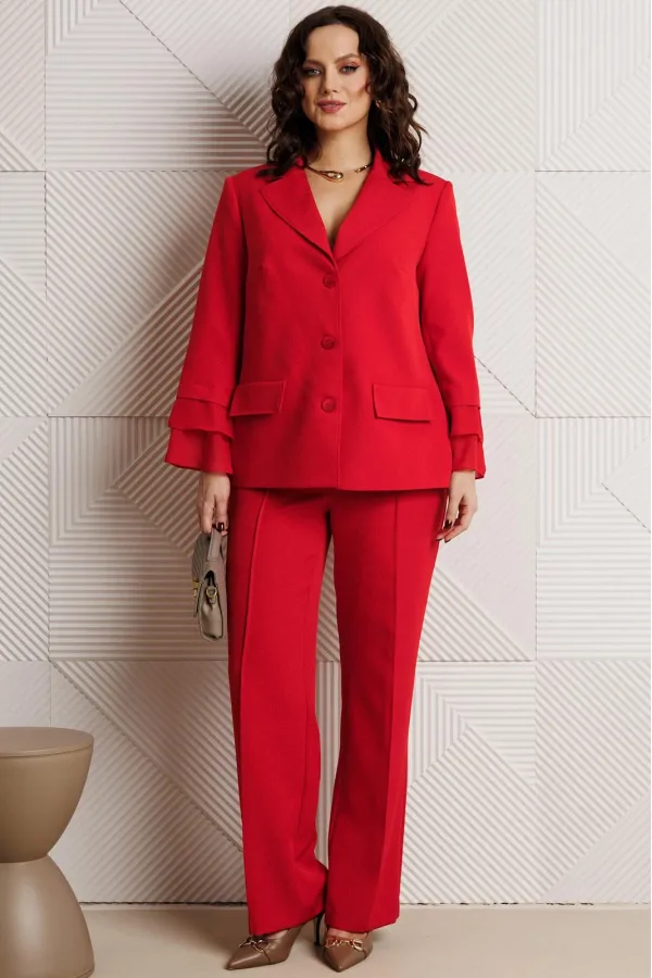 Жакет прямого силуэта с нагрудными вытачками по переду. Накладные клапаны, являются имитацией кармана. По горловине воротник с отложными бортами пиджачного типа. Застежка на три петли-пуговицы. По спинке центральный разрез эффектно оформлен декоративной вставкой из струящегося шифона, который дополняет отделочная пуговица (не функциональная при застегивании). Рукав втачной, двухшовный, длина 7/8. По низу рукава два притачных волана из шифоновой ткани. Жакет на подкладке.