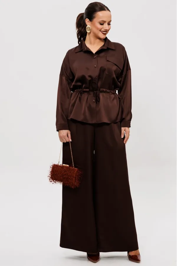 Нарядный брючный костюм, выполненный из струящегося шелка «Армани» (тянется).Блуза прямого силуэта со спущенной линией плеча. По переду накладной карман с клапаном (по правой части переда), центральная застежка на петли-... Читать далее...