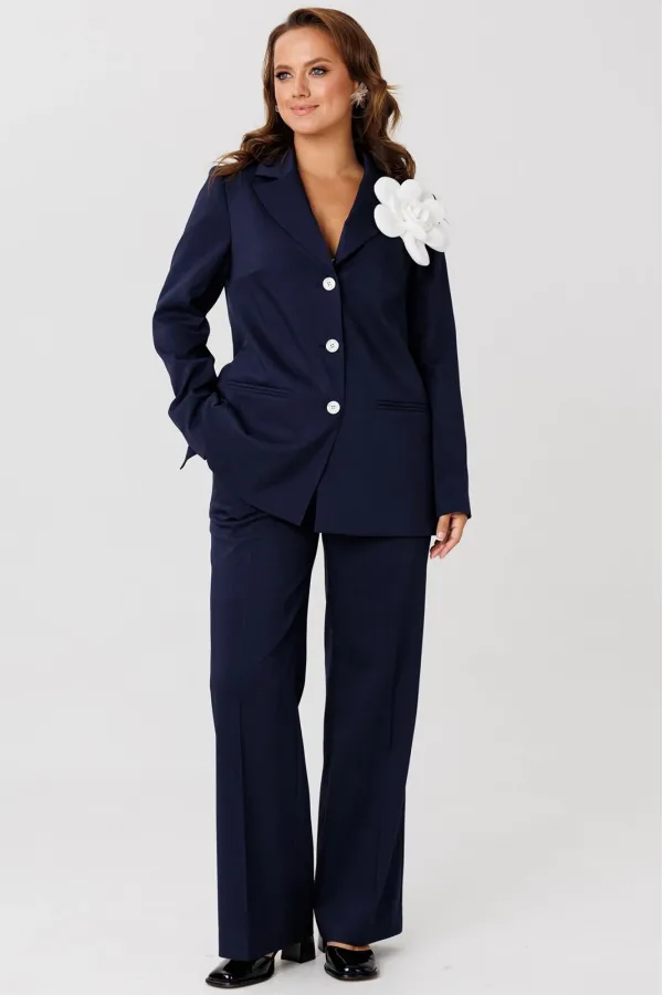 Стильный женский костюм, состоящий из жакета и брюк, изготовлен из костюмной ткани (чуть тянется). Жакет прямого силуэта. По переду нагрудные вытачки. Воротник с отложными бортами пиджачного типа. Застежка на три петли-пуговицы. На полочке функциональные карманы. Спинка с рельефами, переходящими в шлицу. На шлице застежка на три петли-пуговицы. Рукав втачной, двухшовный. Жакет на подкладке. Декоративным элементом является съемный цветок. Брюки свободного кроя с высокой посадкой. В боковых швах функциональные карманы. Верхний срез брюк оформлен поясом с резинкой в боковых швах. Застежка в брюках на тесьму-молнию.