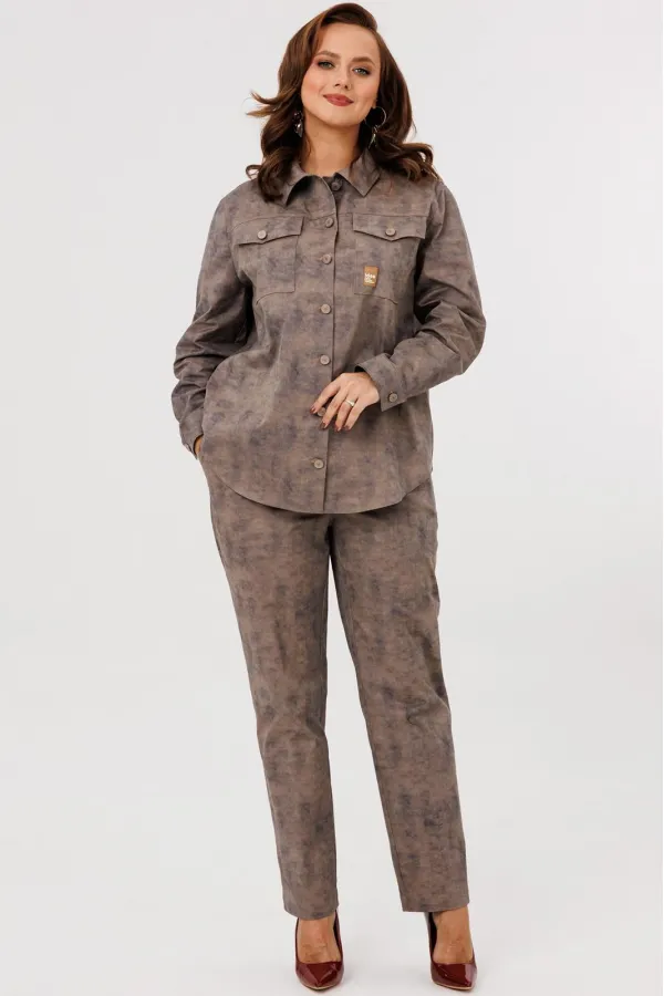 Стильный женский костюм состоит из рубашки и брюк, который выполнен из джинсовой ткани (не тянется). Рубашка прямого силуэта со спущенной линией плеча. По переду отрезные кокетки, в шов которых вставлен клапан, накладные карманы. По левому карману – пришивной лейбл. Застежка центральная на петли-пуговицы. Спинка с отрезной кокеткой, нижняя часть со средним швом. Рукава втачные, двухшовне, по низу с притачной манжетой, застегивающейся на пуговицу. Воротник отложной, рубашечного типа. По боковым швам разрезы, низ прямой, разноуровневый.