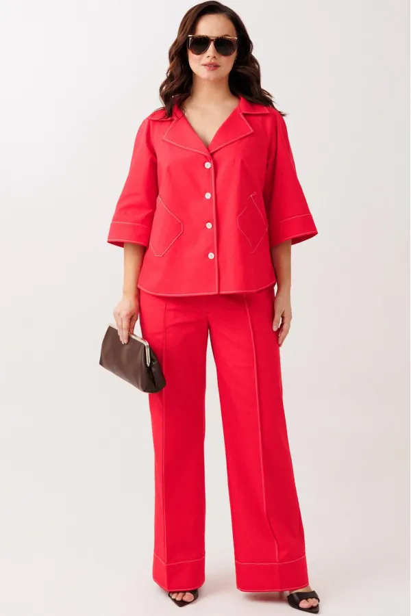 Костюм женский, состоящий из жакета и брюк, выполненный из костюмной ткани (немного тянется) с контрастными отделочными строчками.