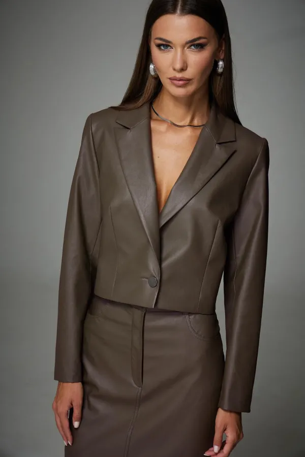 Комплект состоящий из жакета и юбки. Полуприлегающего силуэта, втачного покроя. Выполнен из экокожи на подкладке. Жакет укорочен, закрывает линию талии. Рукав двухшовный, длинный. Горловина обработана воротником пиджачного типа. По переду расположены нагрудные вытачки. Спинка со средним швом и талевыми вытачками. Жакет к низу заужен.