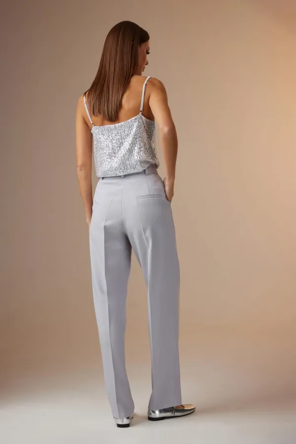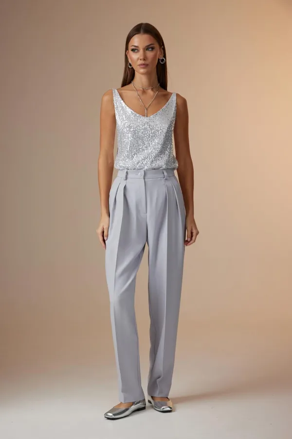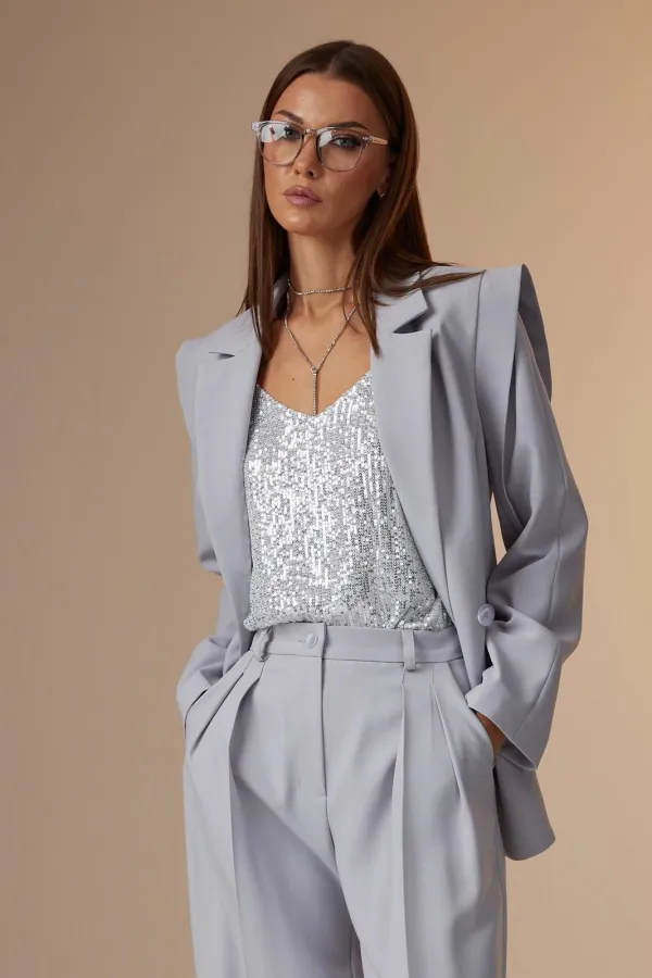 Топ: полуприлегающего силуэта, выполнен из отделочной ткани, с эффектом «пайеток», на подкладке. Вырез горловины «V»-образный, с регулируемыми бретелями по длине.