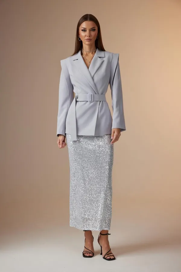 Юбка: длинная, зауженная к низу, с цельнокроенным поясом на резинке. Выполнена из трикотажного полотна с «пайтками». Заднее полотнище юбки со средним швом, в котором расположен разрез выше уровня колена. Изделие на трикотажной подкладке.