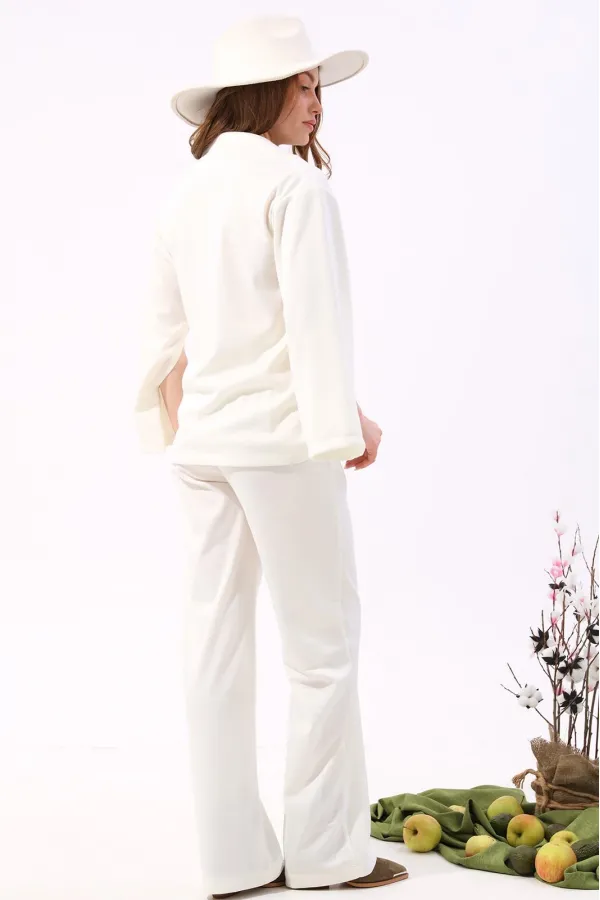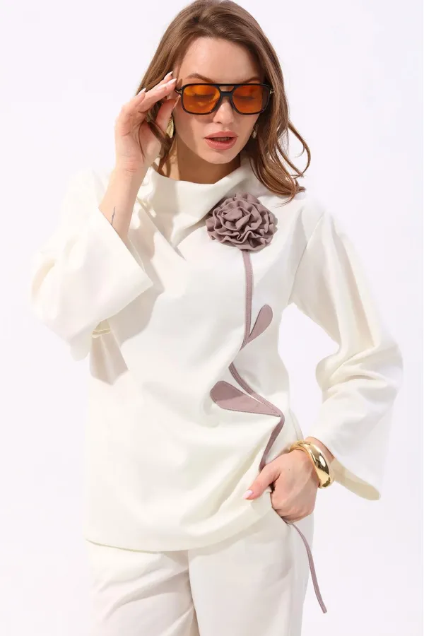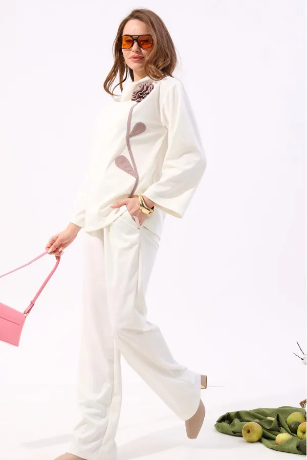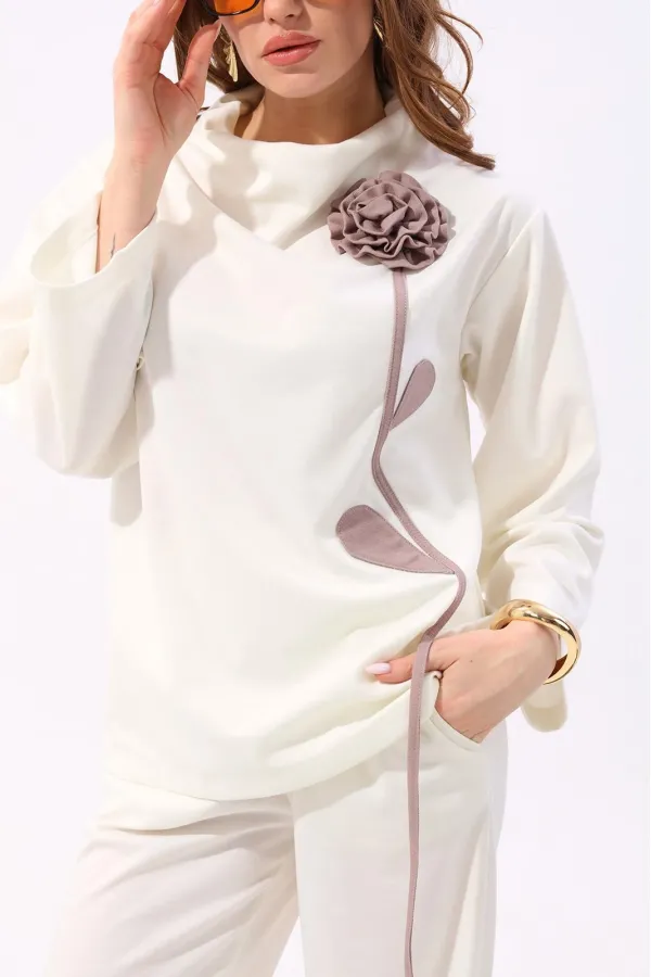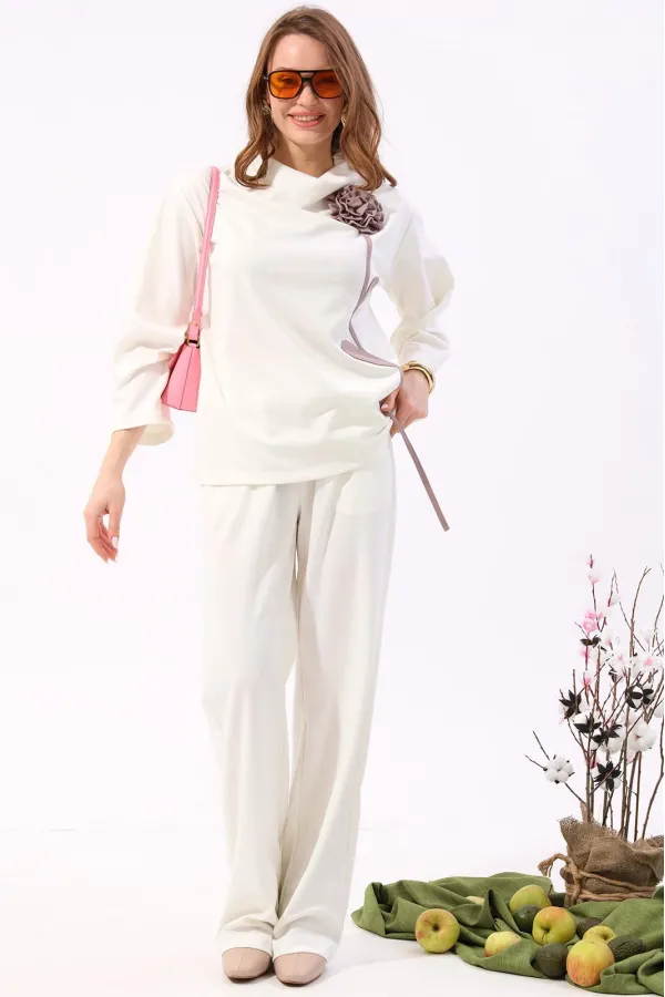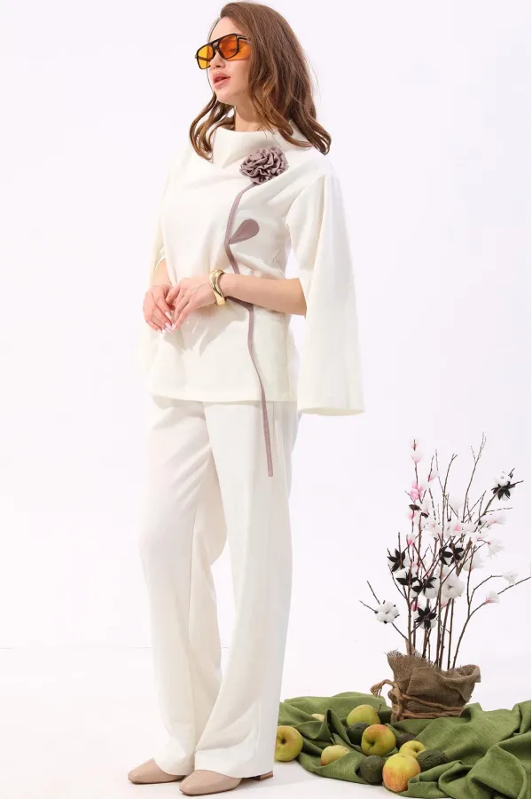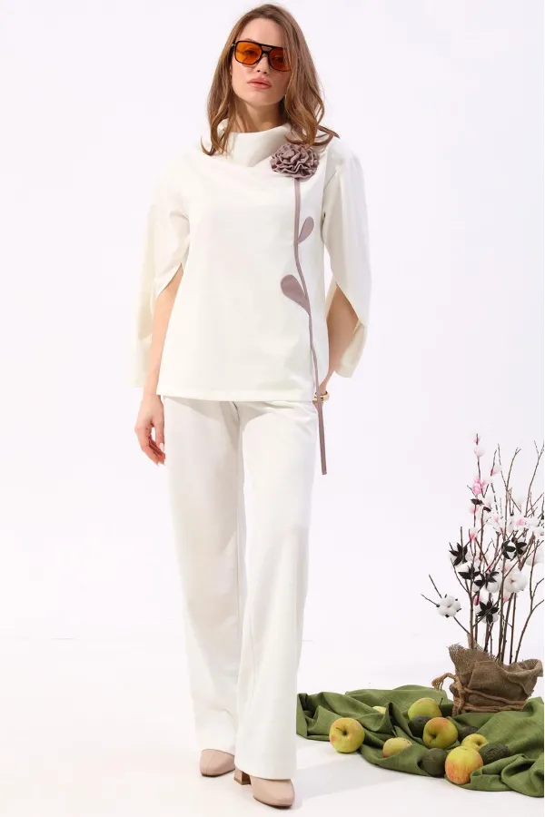 Костюм двухпредметный: состоит из джемпера и брюк. Джемпер-кейп прямого свободного силуэта. Горловина с цельнокроеным воротником-стойкой. Рукав втачной широкий, от линии локтя до запястья есть дополнительное отверстие для рук. Декорирован цветком из контрастной ткани. Брюки свободного кроя, верхний срез представлен широкой резинкой, с карманами.