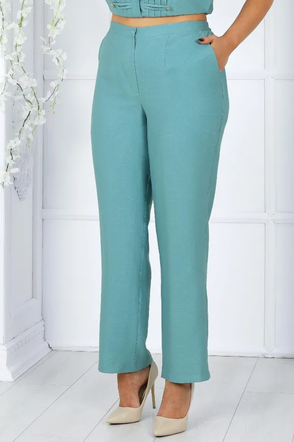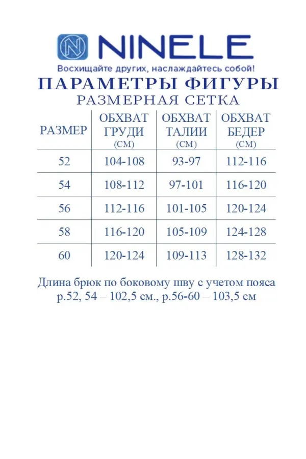 Брюки классические, с посадкой на талии, выполнены из вискозного полотна. Модель с центральной застёжкой на тесьму-«молнию», на притачном поясе, застегивающемся на петлю и пуговицу. Передние и задние половинки брюк с талиевыми вытачками, направленными от пояса вниз. Спереди обработаны боковые наклонные карманы. Для лучшего прилегания брюк в области талии в поясе по задним половинкам вставлена эластичная лента. Длина брюк по боковому (с поясом) – 101,5 см (46-50 р-р), 102,5 см (52-54 р-р), 103,5 см (56-60 р-р).