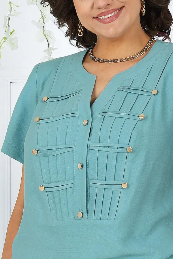 Блузка полуприлегающего силуэта, выполнена из вискозного полотна. Модель с плечевыми накладками и разрезами в боковых швах. Перед декорирован вставками с застроченными вертикальными защипами и отрезными фигурными планками, застегивающимися на 3 петли и 3 пуговицы. От планок к швам притачивания вставок направлены навесные петли, застегнутые на пуговицы. Спинка со средним швом; круглая горловина спинки обработана отрезной фигурной бейкой. Рукав короткий, втачной. Длина блузки – 66,5 (46-50 р-р) см, 69 см (52-60 р-р); длина рукава – 19,5 см (46-50 р-р), 20,0 (52-60 р-р) см.