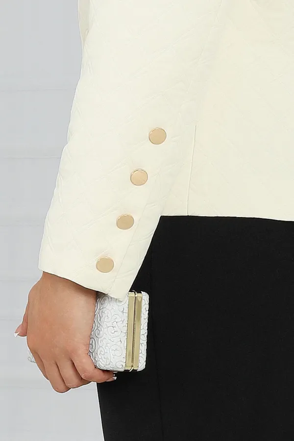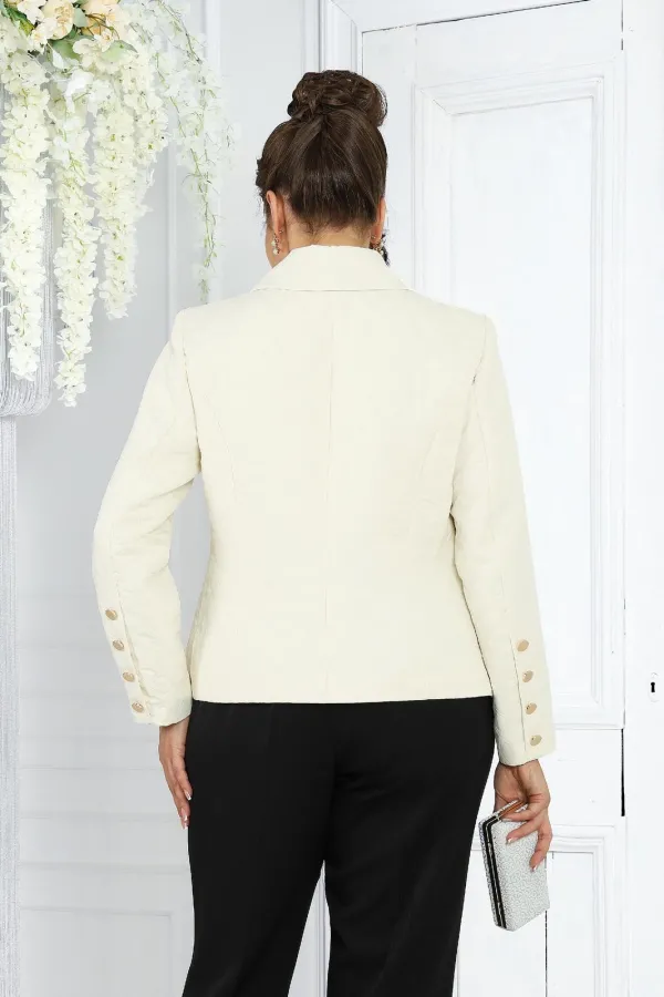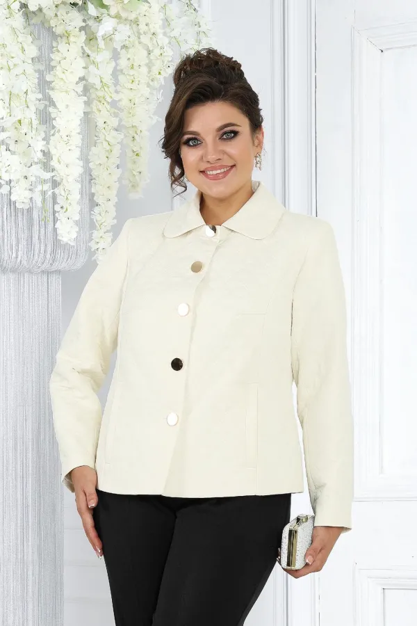 Жакет полуприлегающего силуэта, с центральной бортовой застежкой на 5 петель и 5 пуговиц. Длина жакета по среднему шву спинки 59 см. Перед с рельефными швами от пройм до низа проходящими не через центр груди, с нагрудной вытачкой от рельефного шва к центру. По переду расположен карман с листочкой в рельефе. Спинка со средним швом, с рельефными швами от пройм до низа. Рукава втачные, двухшовный, по низу рукава имитация шлицы, с застежкой на 4 пуговицы. Длина рукава 61 см. Горловина круглая с отложным воротником. Жакет на подкладке с плечевыми накладками.