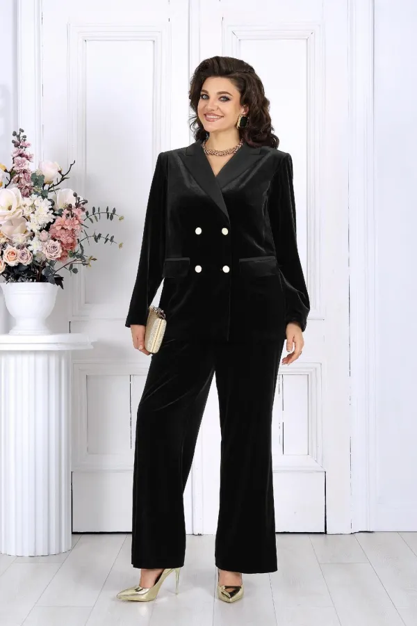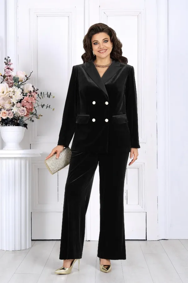Этот костюм — воплощение классики вечерней моды и станет незаменимым вариантом для женщин, которые ищут стильный и одновременно комфортный наряд на торжество. Воротник и лацканы из сатина придают изделию утонченный и благородный вид, что делает его подходящим для новогоднего корпоратива, свадьбы или юбилея. Высококачественные материалы и продуманное лекало обеспечивают не только привлекательный внешний вид, но и максимальный комфорт. Такой костюм идеально подойдет для полных женщин, которые ценят элегантность и удобство.