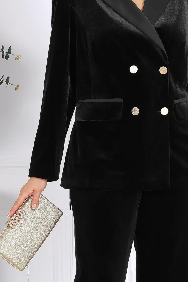 Жакет классический на подкладке, выполнен из велюра. Модель полуприлегающего силуэта с отложным воротником и лацканами «ласточкино крыло». Спереди обработаны смещенные к боковым рельефные швы, направленные от пройм до низа, и вытачки, идущие от прорезных карманов с клапаном до центра груди. Перед с двубортной внешней застежкой на 2 металлические пуговицы и внутренней на 2 потайные. Спинка со средним и рельефными швами. Рукав длинный, втачной, двухшовный. Воротник, лацканы и «рамка» кармана выполнены из сатина в цвет основной ткани. Длина жакета-67 см; длина рукава-61 см.