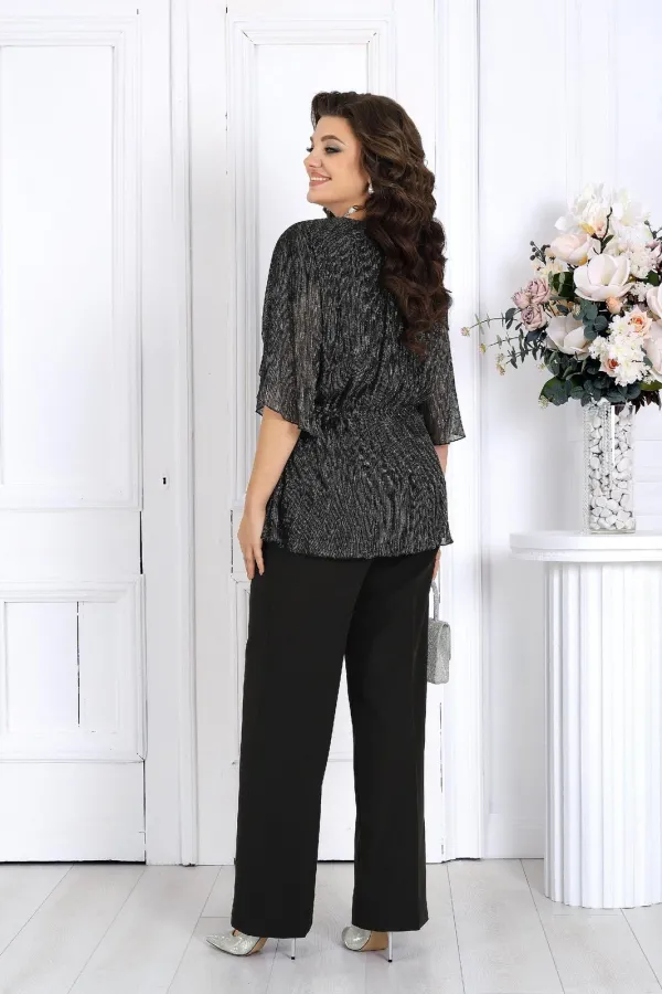 Этот костюм станет вашим универсальным решением: праздничный вечер, деловая встреча, торжественный ужин или новогодний приём — он уместен везде. Блузка с благородным мерцанием делает образ утончённым и эффектным, придавая нотку торжественности без излишнего блеска.